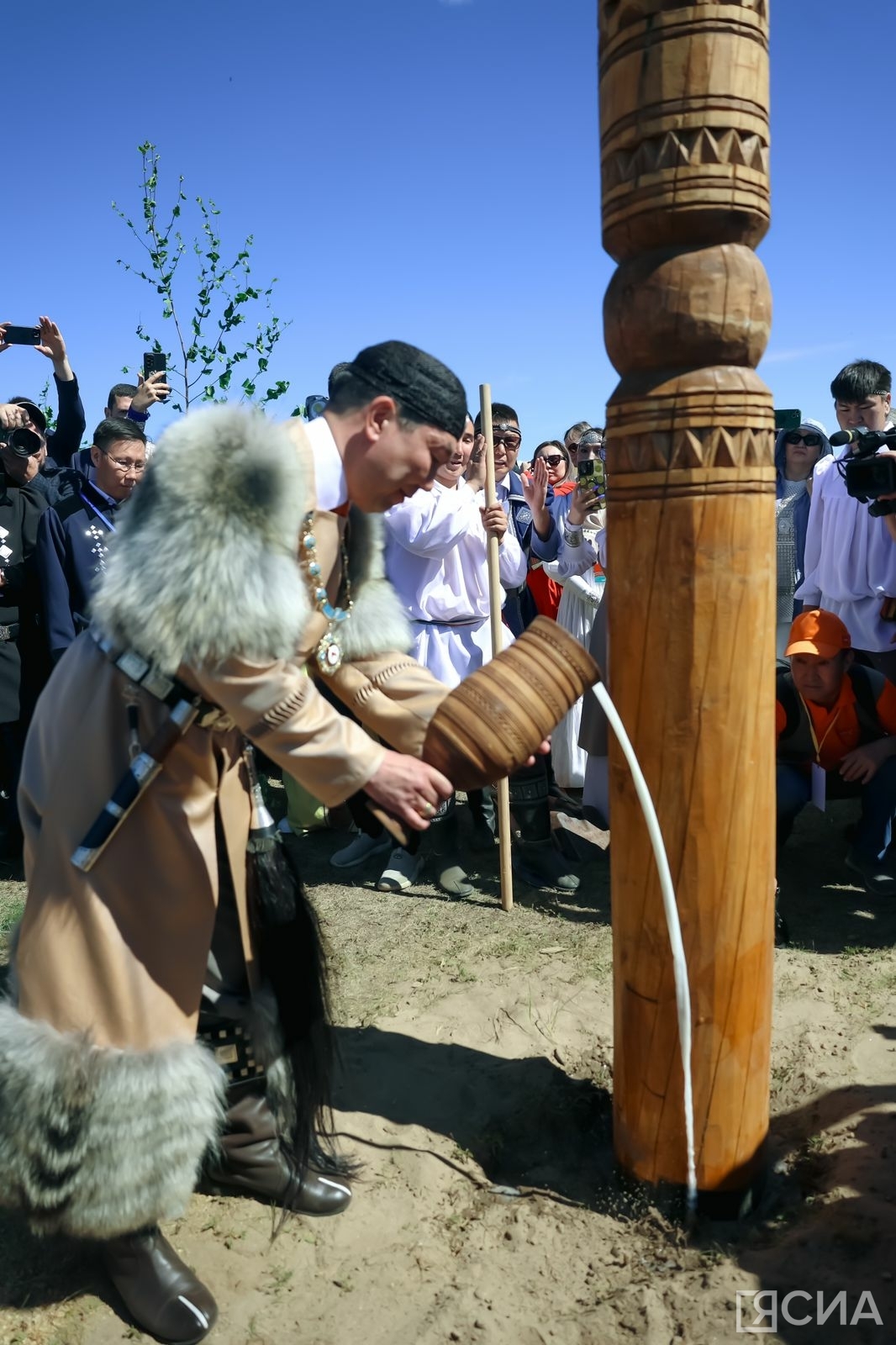 Летом на национальном празднике Ысыах Айсен Николаев проводит кормление кумысом духов-хозяев земли в соответствии с обрядами традиционной якутской религии.