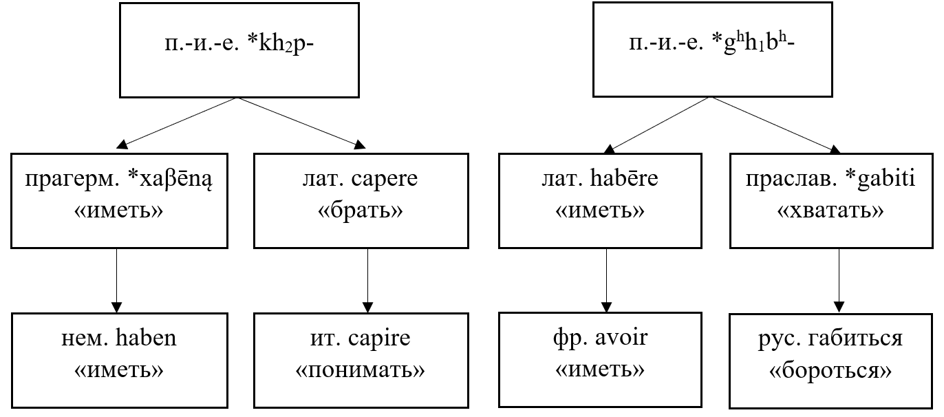 Таким образом, немецкое haben (а правильнее, прагерманское *xaβēną) не может быть родственником латинского habēre. В латыни мы бы ожидали корень вроде cap-. И такой корень в латыни действительно есть – это capere /кáпэрэ/«брать». Его потомком является, например, итальянское capire /капи́рэ/ «понимать».