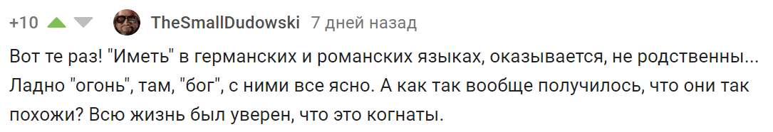 А что насчёт значения? Ведь «брать» и «иметь» - это не одно и то же. Однако мы знаем пример именно такого развития семантики «взять» > «иметь». Это собственно наши русские глаголы взять и иметь (о том, как это возможно фонетически я рассказывал в отдельном посте).