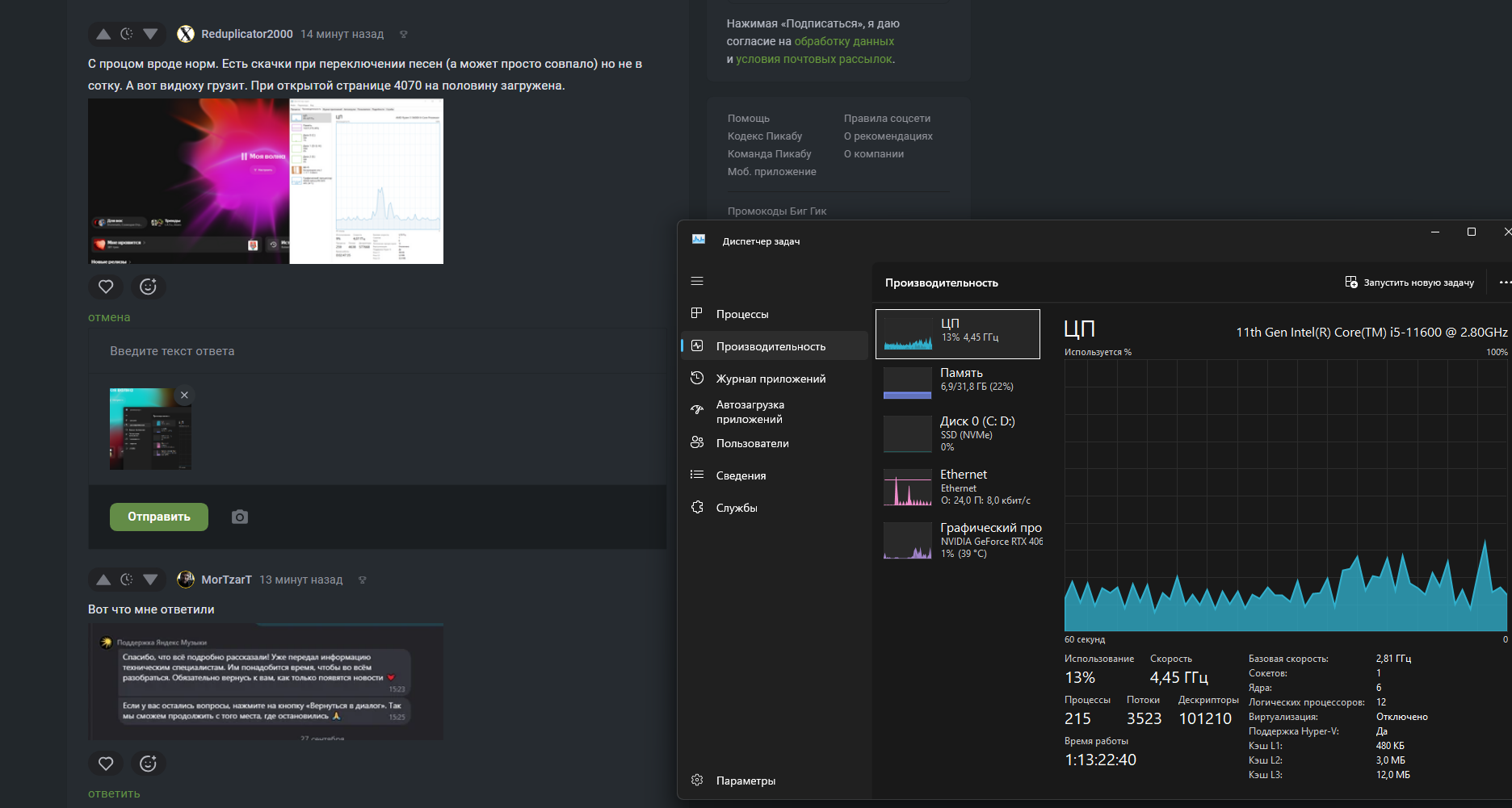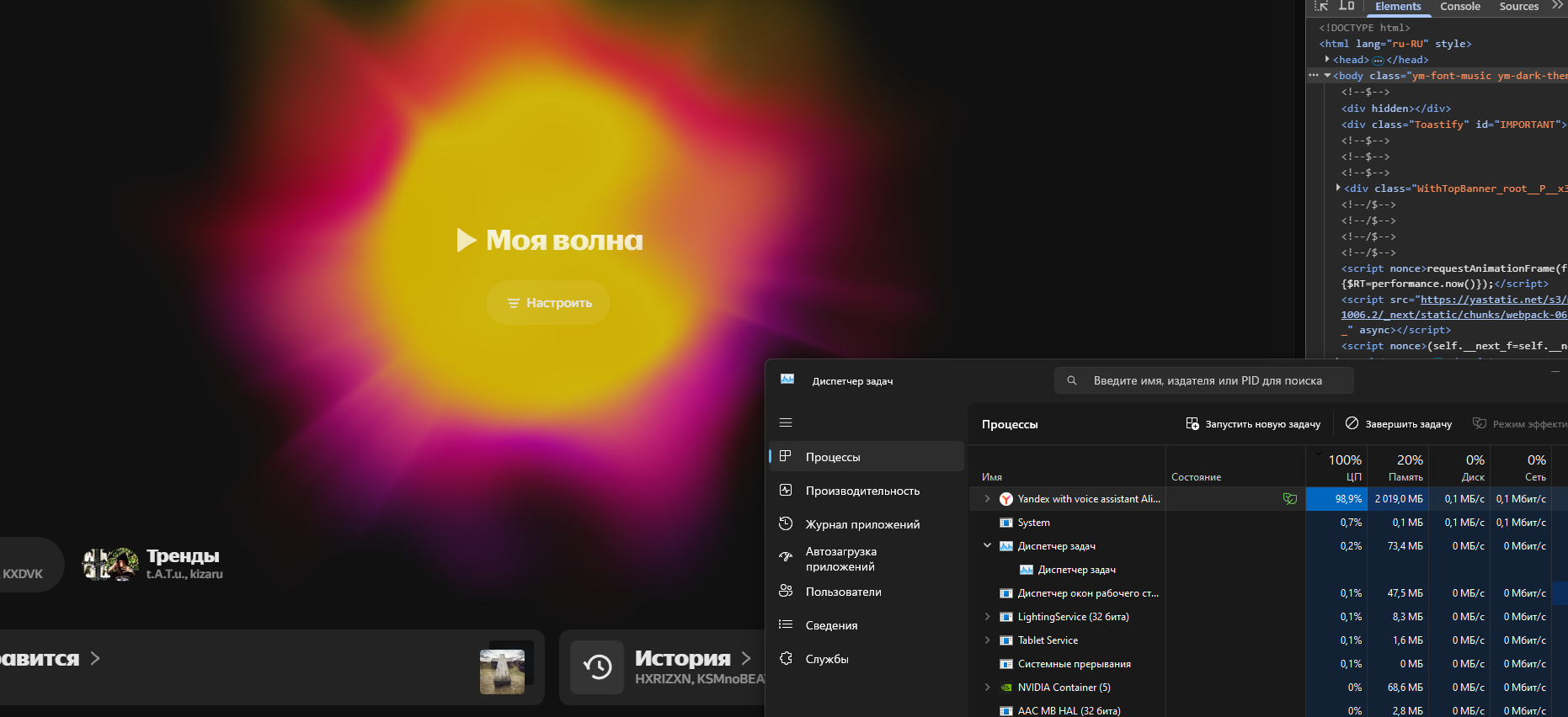 Не знаю может у кого такая же проблема или нет, на ЯМ пол года назад примерно появилось новое оформление Главной страницы и анимация "Моей волны" жрало всю мощность процессора, но пол года назад можно было вернуться к старой версии, сейчас же такой функции нету. Тогда в поддержке спрашивали мои характеристики и говорили что им известно об этой проблеме. Я так и не понял неужели за пол года или даже больше им была известна проблема и они все таки решили выложить такую версию которая на 100% грузит процессор скорее всего из за простой анимации. Хотел просто узнать может что то и вправду с моим компом не так.