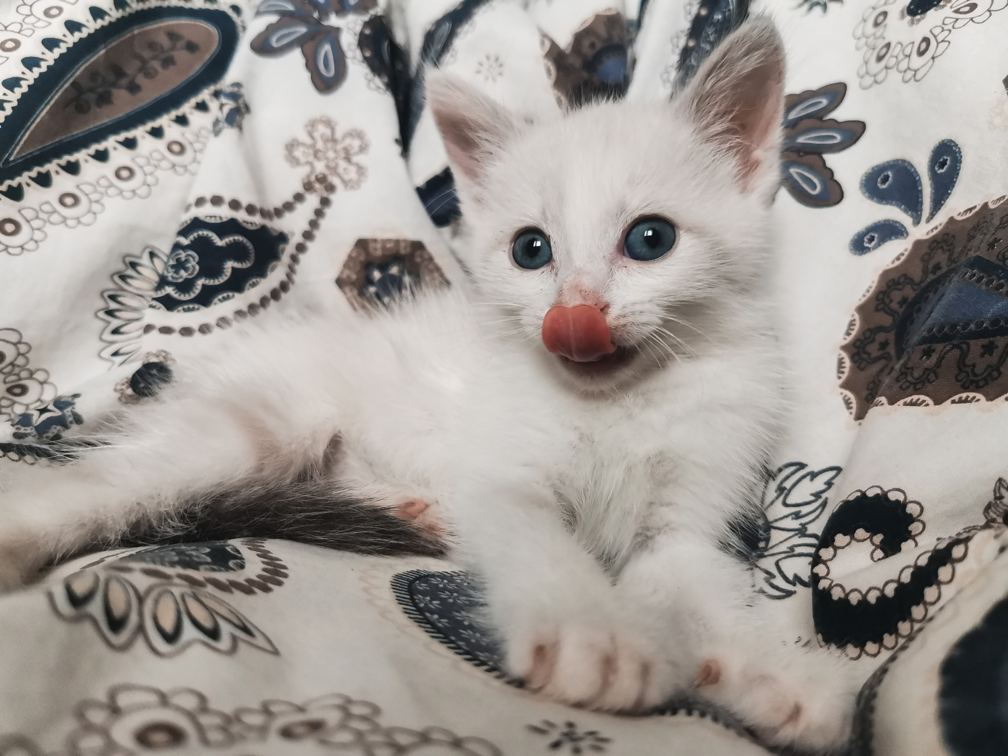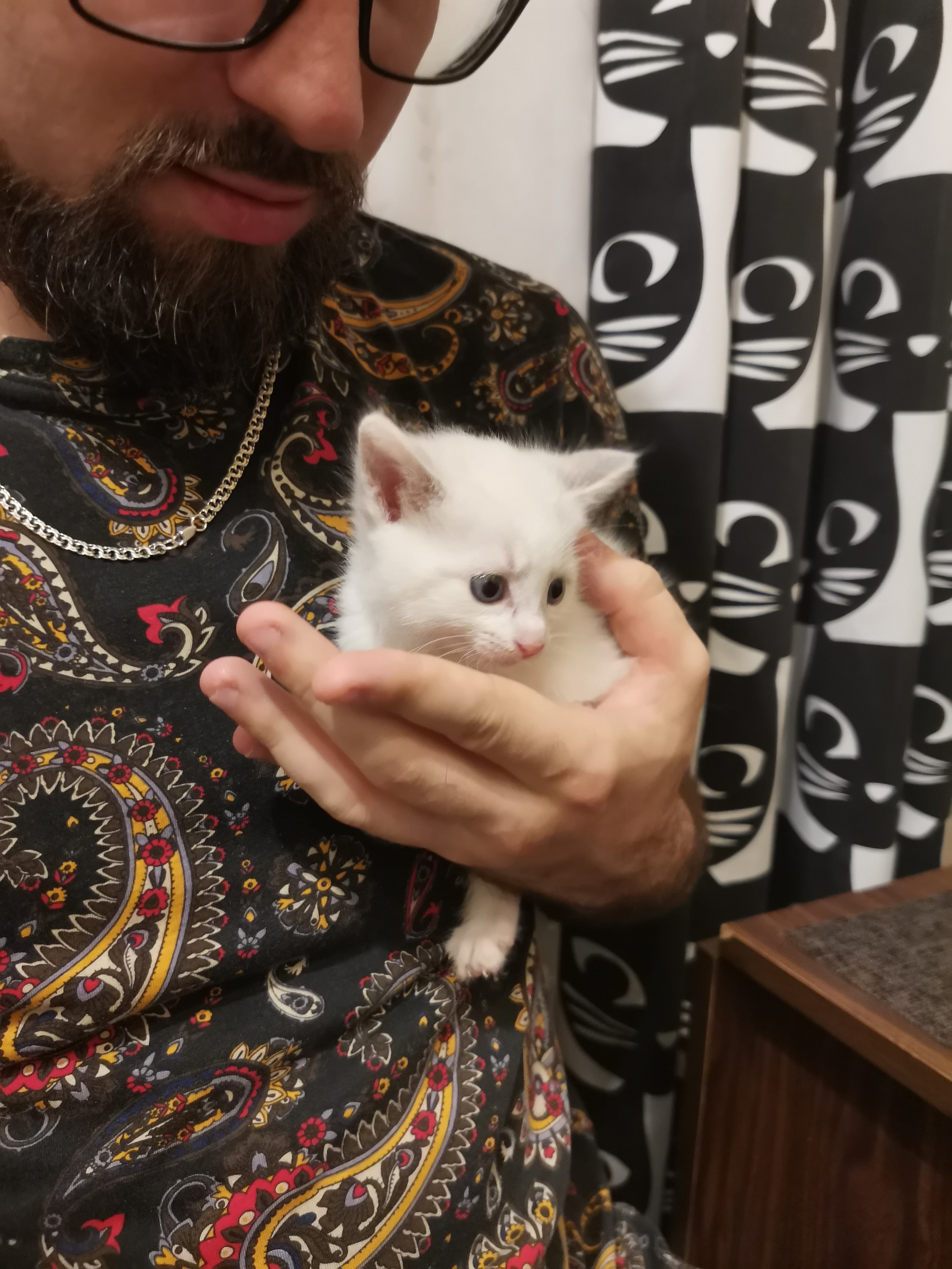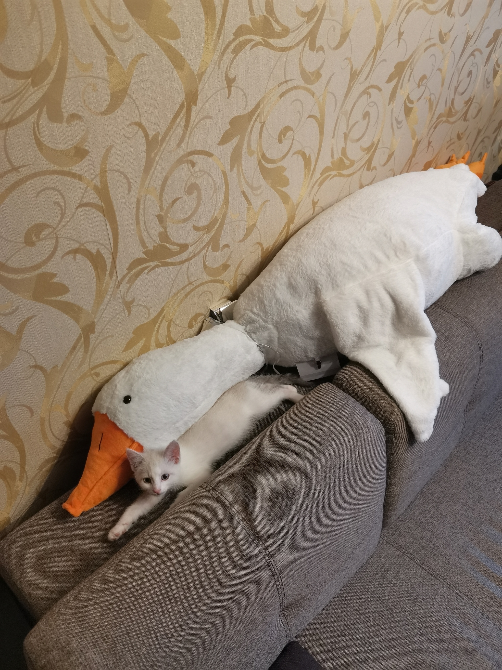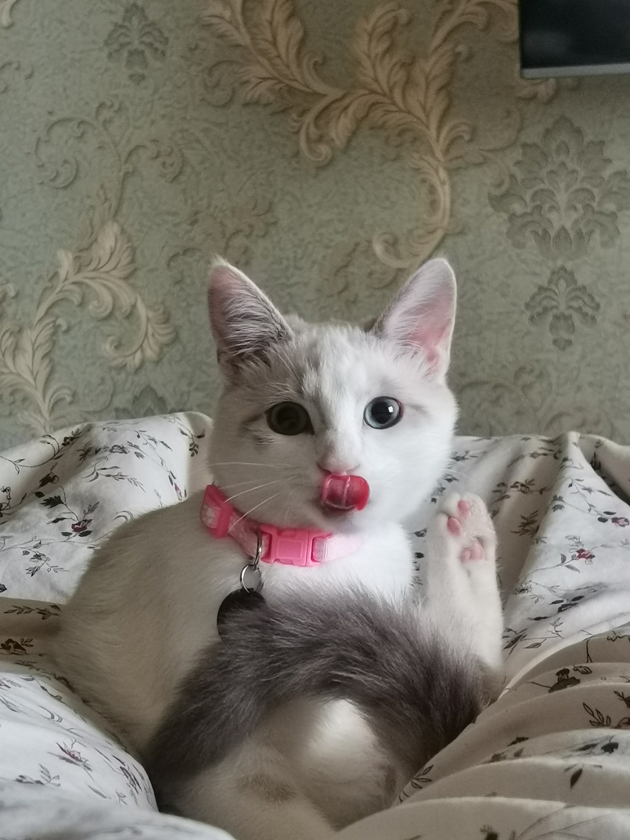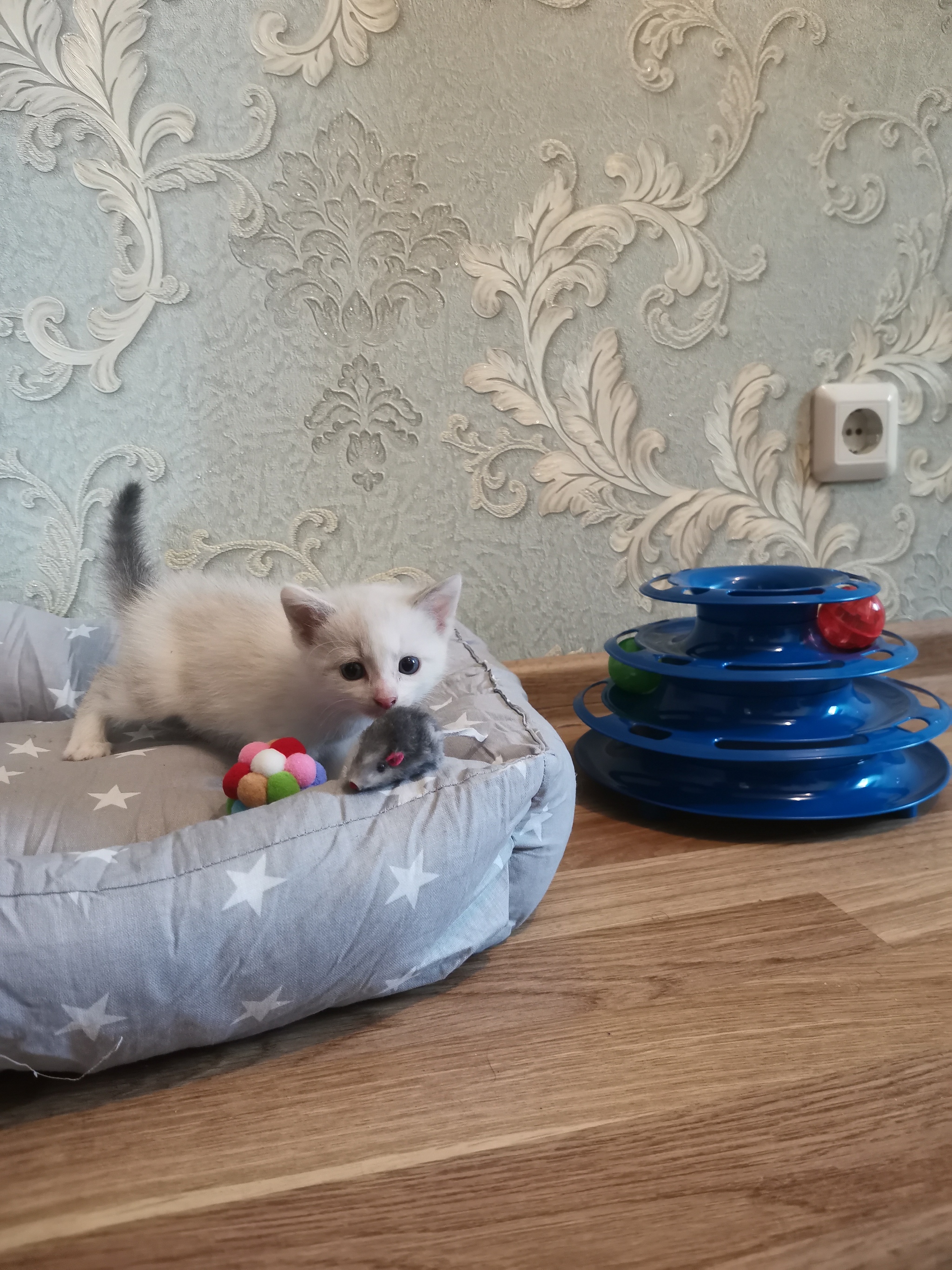 Родилась она 9 мая 2024 у одной женщины на участке. Мать-кошка была уличная, искала место где пригнездиться для родов. Нашла какую-то пристройку к дому, там и родила 4-х малышей. Хозяйка участка стала раздавать котят: одного себе в квартиру забрала, Дину забрали мы. Двоих оставшихся женщине пришлось выпустить по осени на улицу.