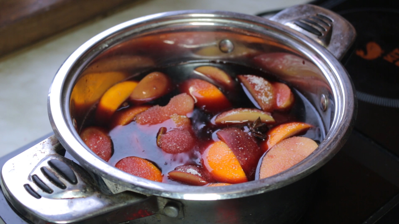 Разогреваем глинтвейн до температуры 75-80 градусов, накрываем крышкой и снимаем с плиты. Даём ему настояться в течение 10-15 минут.