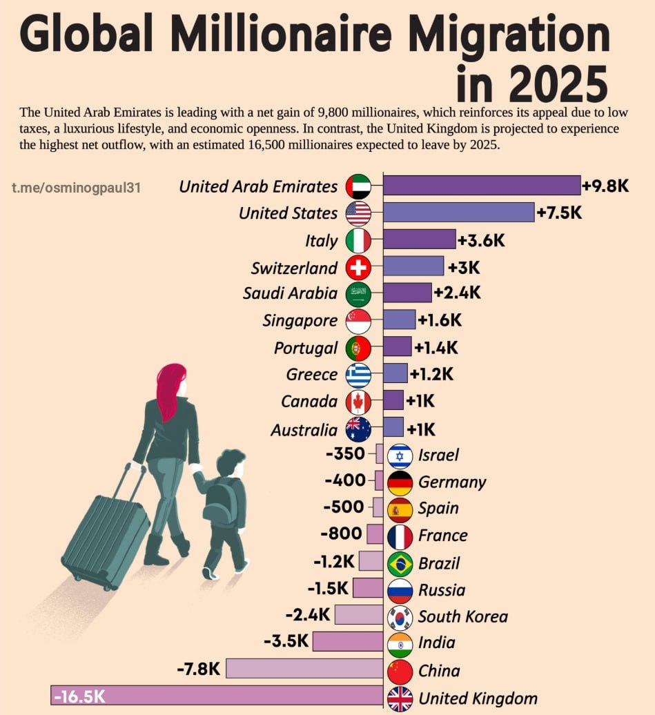 Тем временем 🇬🇧Соединенное Королевство переживает самый большой отток миллионеров за всю историю: прогнозируется чистая потеря 16 500 миллионеров в 2025 году. Эта цифра почти вдвое превышает число из 🇨🇳Китая, который находится на втором месте (нужно учитывать ещё колличество населения, например: население 🇨🇳Китая больше населения 🇬🇧Великобритании в 20 раз)