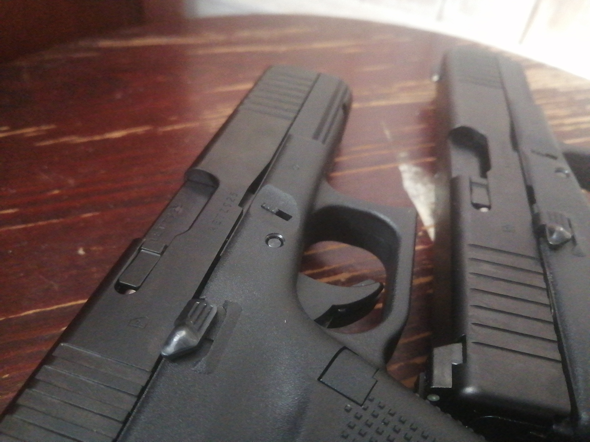 Моё впечатление основывается на моем же опыте владения. Вальтер совсем не кажется громадным и толстым в сравнении с глоком. Вальтер длиннее, что лучше при прицеливании, но носить его удобнее.