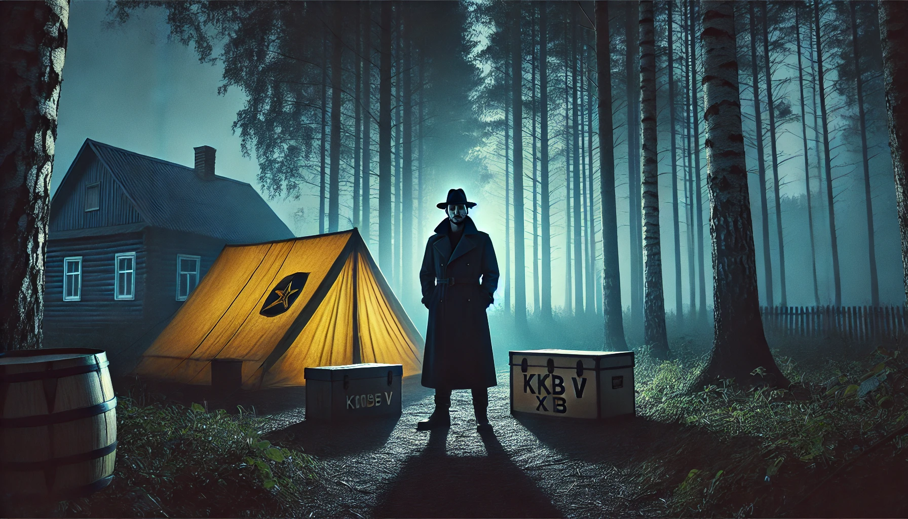 Три размытых силуэта под брезентом. Один — просевший, как будто что-то тяжёлое падало сверху. Пара деревянных ящиков — вскрытых. Одна металлическая раскладушка. Аудио магнитофон. Полевые тетради — раскиданы, некоторые намокли от недавнего дождя.