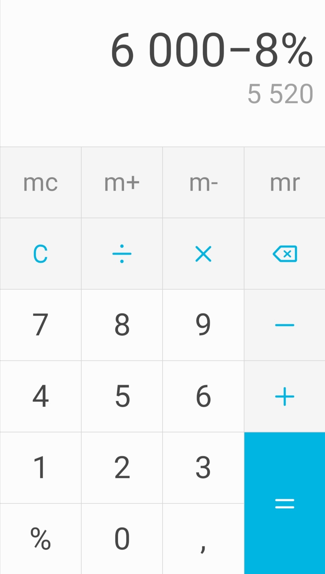 Значит, имелось число 6250 и мне нужно было узнать 8% от него. Проделываю необходимые вычисления на мобильном калькуляторе,посчитать посчитал, да не так, уж больно мало получилось. Ну думаю мало ли, может ошибся. Перепроверил несколько раз, результат один.