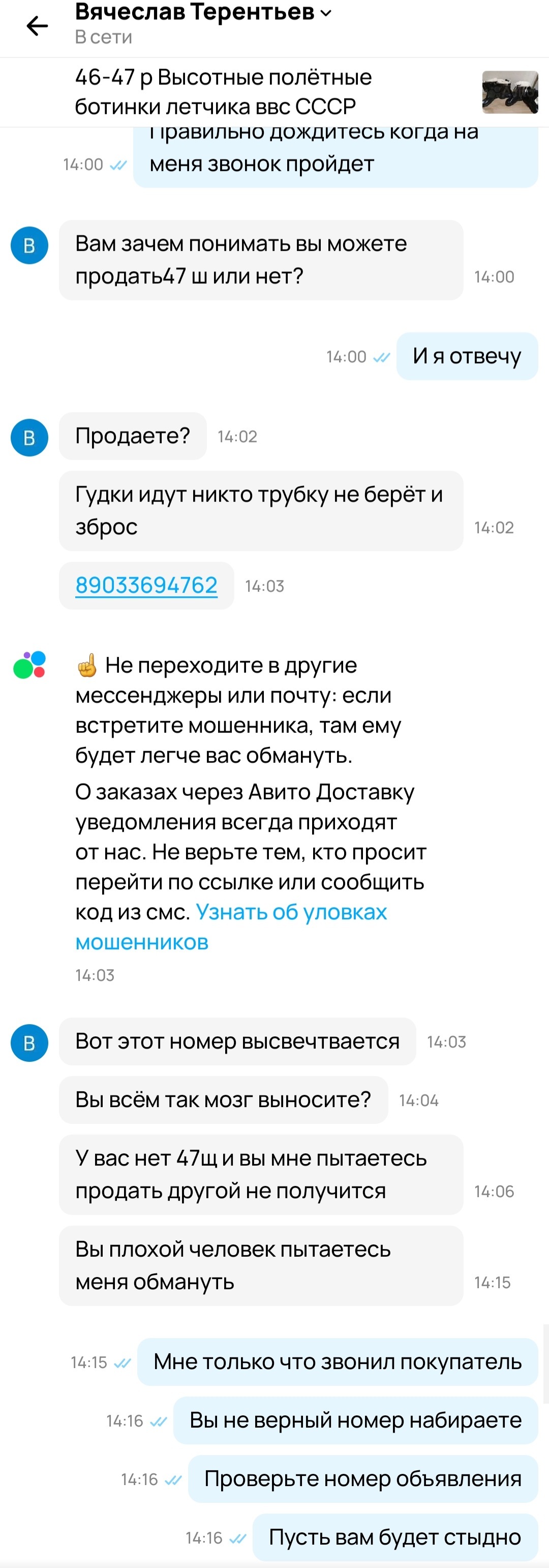 Ситуация следующая: некий Вячеслав Терентьев ниже его профиль, начал мне писать с покупкой, я ему пишу нужно замер сделать, для четкого понимания какая именно пара подойдет, в регионы с отправкой без него не продаю. Он начал требовать номер телефона, с учётом правил авито мне запрещено ему сообщать свои контракты (блокировали несколько раз), пишу ему что звоните на номер в объявлении, он мне клянётся что уже звонил 5 раз, однако в диалоге нет подтверждения звонков. Скриншот звонков он не в состоянии прислать. Пишет номер на который звонит, а выходит он ошибся или специально написал одну цифру не верно. Потом он начинает меня оскорблять. Далее с ним веду вежливо переписку и тут меня "прекрасное" авито блокируют. Спрашиваю за что? Ниже смотрите их сплошные тупые шаблоны ответы.