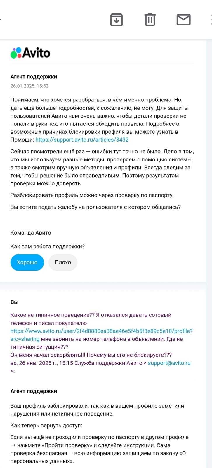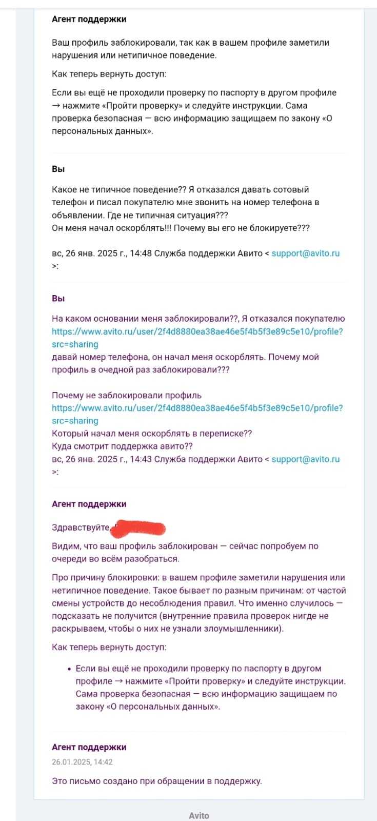 Сколько будет продолжаться издевательства не ясно?? Сколько раз они проверяли меня в ручную!! Постоянно у авито какие-то новые глюки! То пишут я оскорблял, хотя этого не было!! Доказательства не могут предоставить, то обвиняют, что номер телефона дал покупателю, хотя такого не было.!!