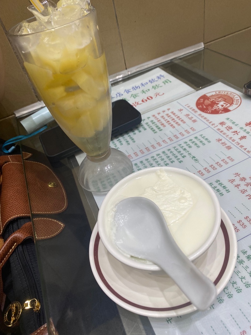 2) Этот же молочный десерт + странный напиток. Ощущение что они просто консервированные ананасы из банки налили и льда добавили, все тоже самое