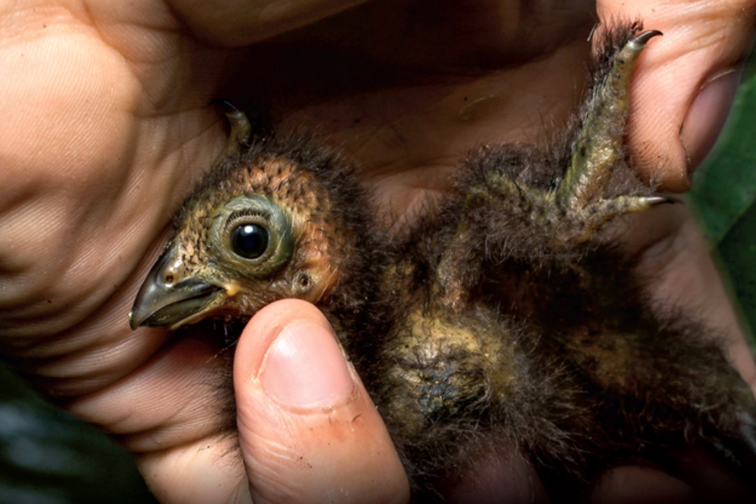 Птенцы гоацинов рождаются с пальцами на крыльях, два их которых снабжены когтями, которыми они пользуются, пока не умеют летать и лазают по деревьям.