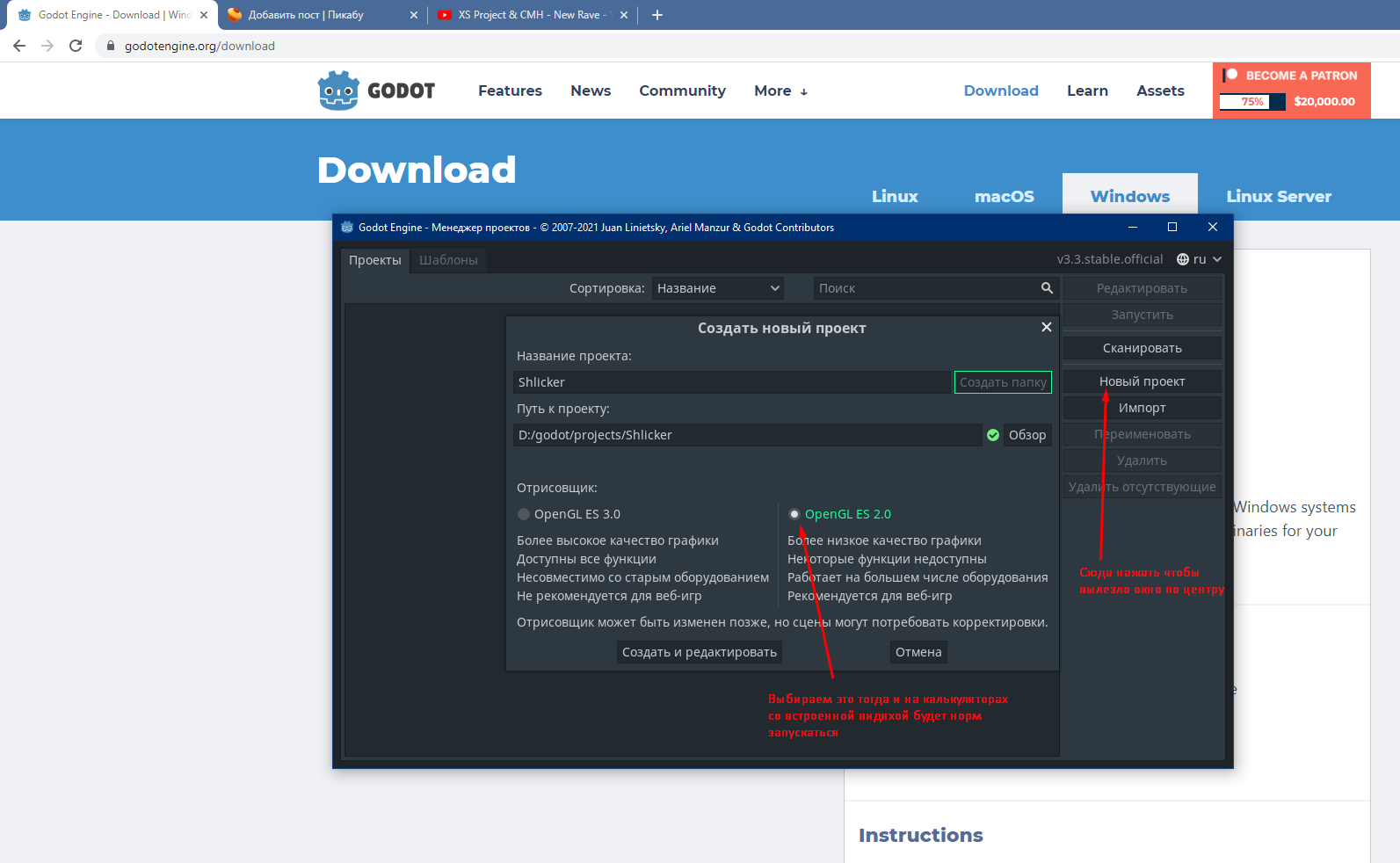 Создаем новый проект, креативим название, создаем папку, отрисовщик ставим OpenGL ES 2.0