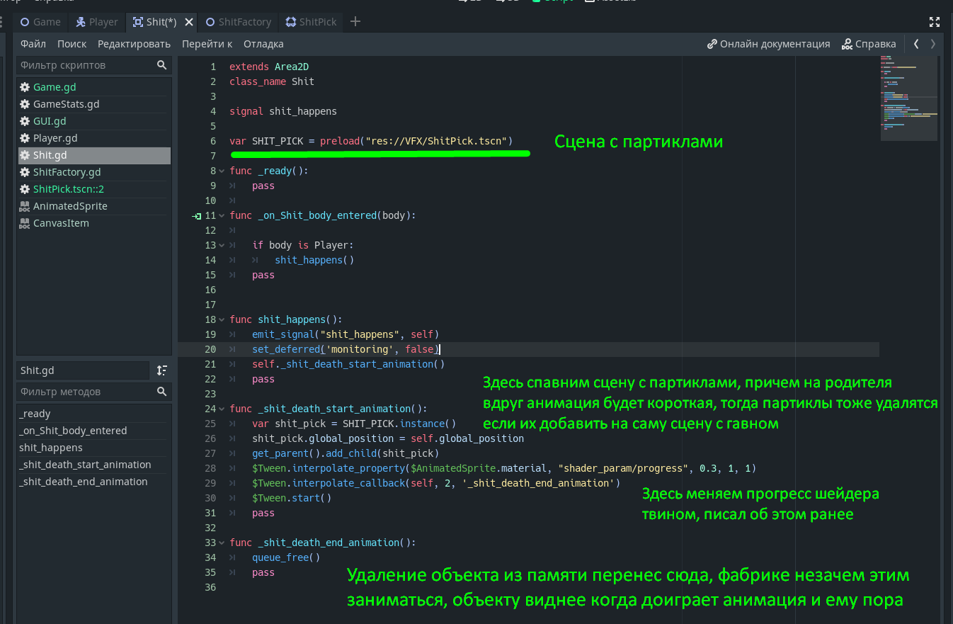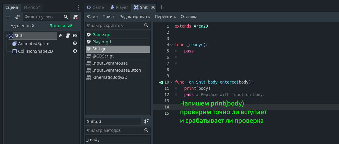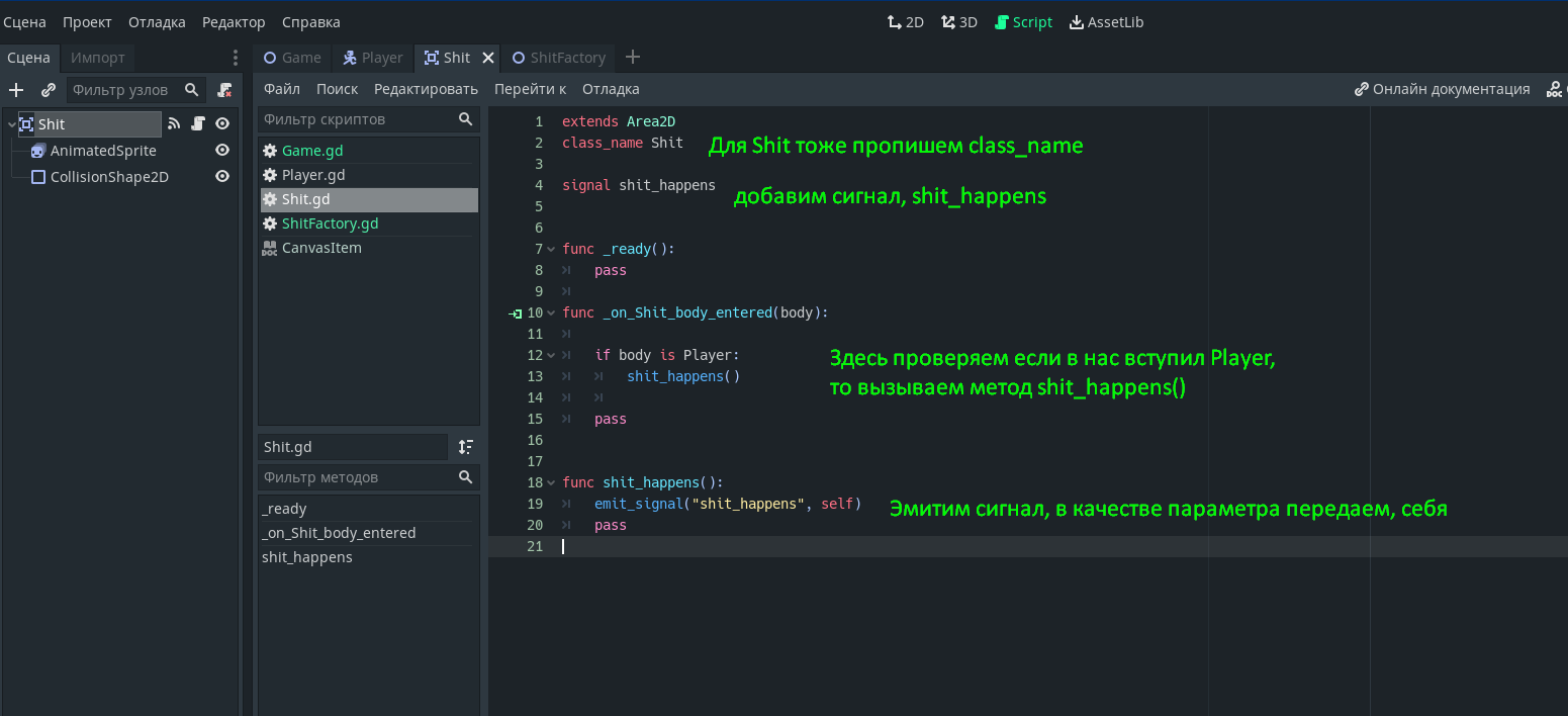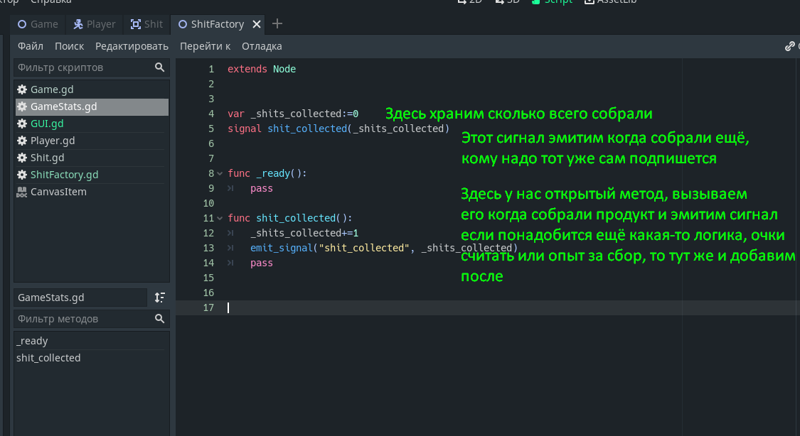Ну теперь как видим вступает нормально, а благодаря тому, что мы написали class_name Player, довольно точно определяет кто именно вступил, пока у нас бегает один игрок, это не принципиально, но если появятся и NPC конкуренты, то в будущем нам это пригодится. Теперь напишем фабрику, для генерации рандомного гавна.