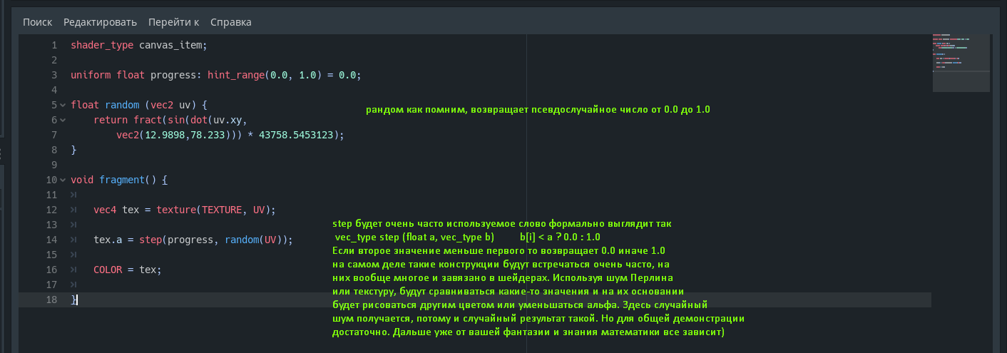 Для понимания предыдущего, суперского туториала, нужно сказать пару слов, там используется GLSL, в godot свой язык шейдеров, но глобально это тот же самый GLSL. По следующей ссылке, детально расписано, как конвертить GLSL в godot'овский ну и так же обратно.
