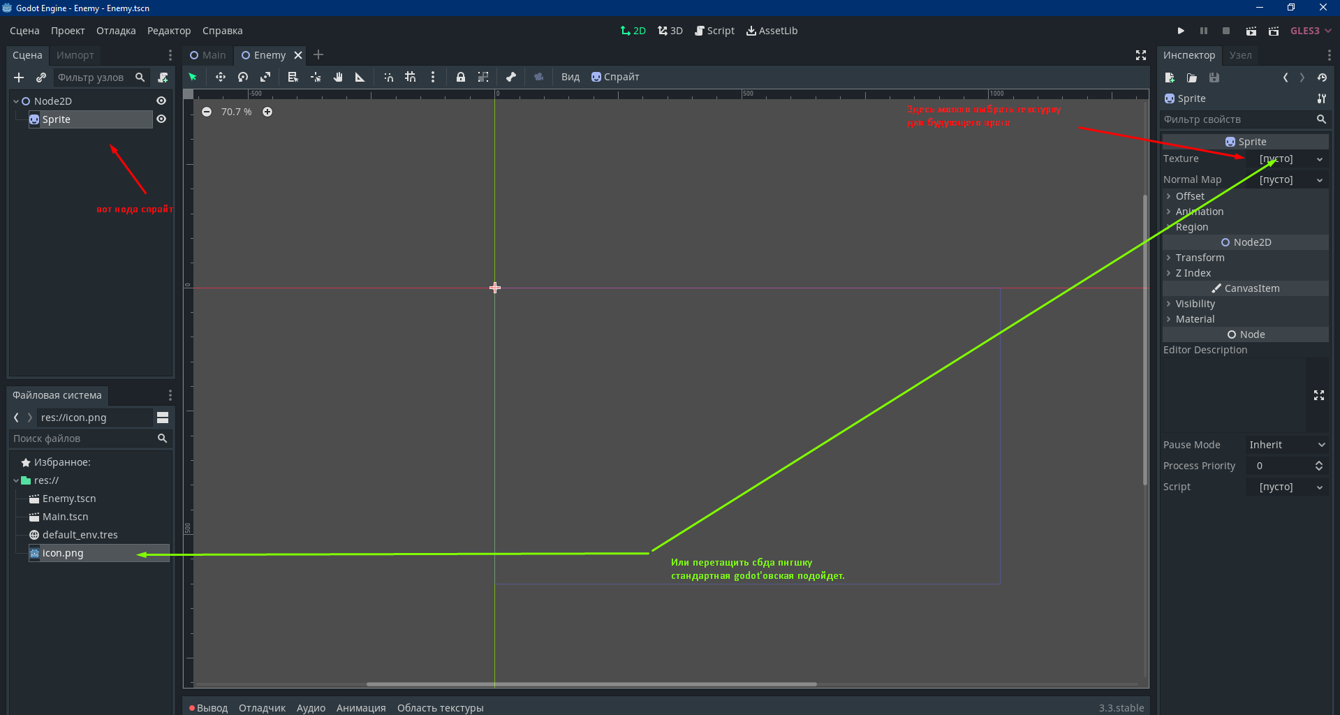 Создам новый проект, основную сцену неважно, как назвать. Создам ещё одну сцену, назову её Enemy, сцена наследуется от Node2d скриншоты каждого шага делать не буду, их уже показывал ранее. На сцену Enemy добавляем ноду Sprite.