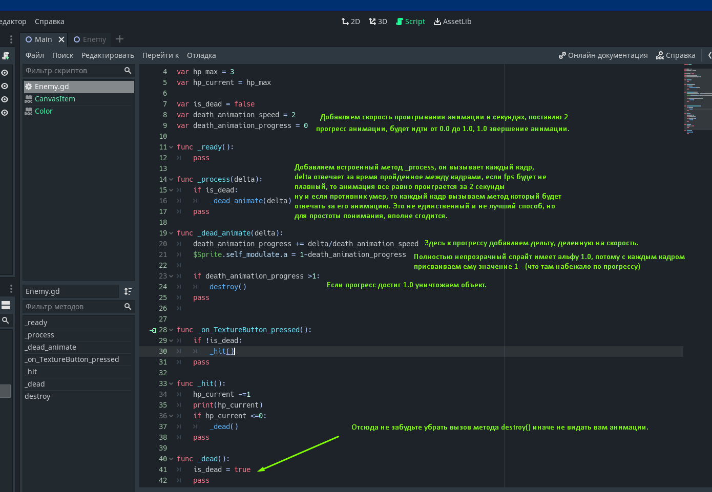 Ну раз враги умирают, неплохо бы это визуально показать игроку, что они действительно умерли и так и было задумано, а не просто пропали хрен пойми с чего.