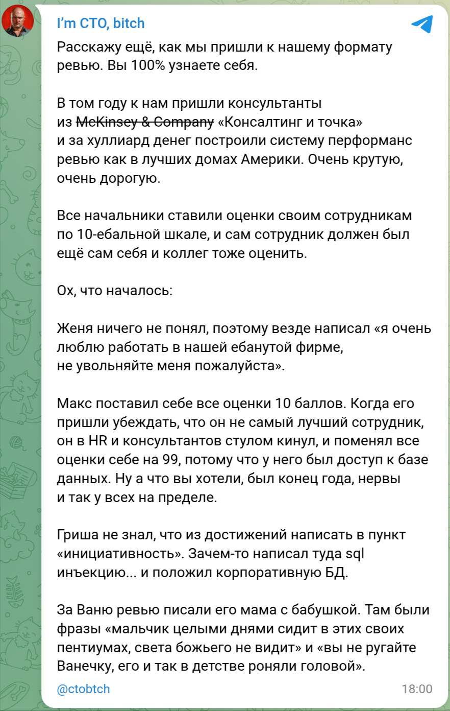 516 imctobitch Норм автор IT-юмор Годовое ревью Серия I'm CTO, bitch 6 часов назад 👉️ Продолжение о том, как мы изменили наше годовое ревью [моё] I`m CTO bitch IT юмор Рецензия Мат Sql injection Консультант Эффективный менеджер Менеджмент Работа HR Маменькин сынок 98 3 1 1 1 1 Ещё 1