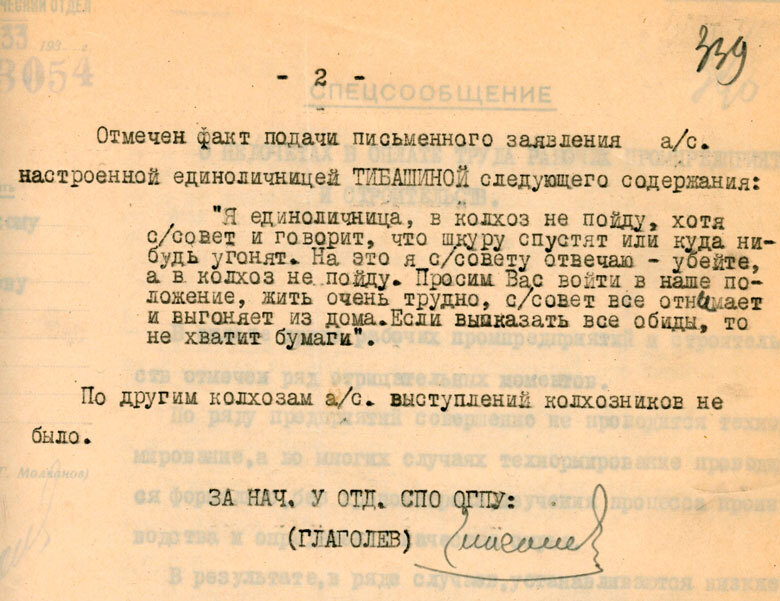 Члены правления колхоза с. Моисеевка по поводу полученного колхозом плана хлебозаготовок заявляют: «План в 9 тыс. пуд. для нашего колхоза большой, выполнить его — значит оставить народ голодным. В прошлом году старое руководство издевалось над колхозниками, оставило их без хлеба и за это его судили, новое руководство также начинает брать как и прежнее, значит, это делает не район, а кто-то другой. А нас проведением суда только обманули».