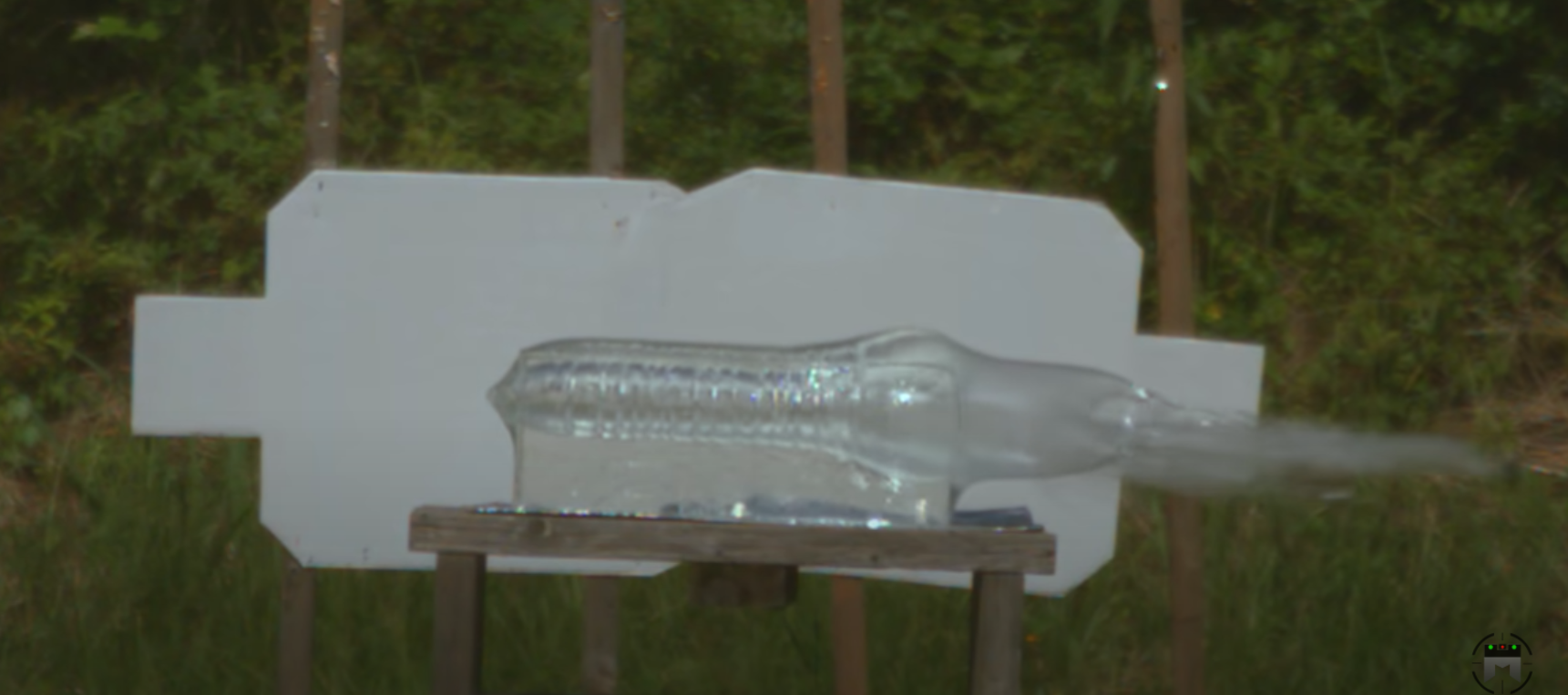 .50 BMG, предположительно оболочечная M33 или её варианты массой 660 гран (в начале ролика демонстрировали БЗТ пулю M20 массой 619 гран, но она бы дала заметную вспышку и облако дыма при попадании). Выстрел промеж глаз.