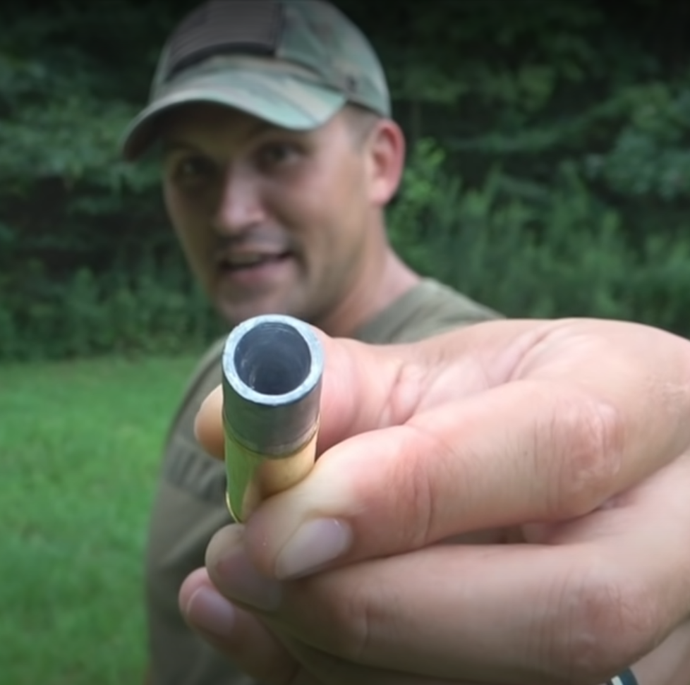 Любимая пятидесятка Скотта - 500-й Смитт-Вессон Магнум. Он ещё и притащил особенную пулю Vaporizer, которая по сути представляет собой огромную экспансивку. Длина, как у цельного снаряда на 700 гран, но так как тут очень глубокая ямка и тонкие стенки, то, естественно, она намного легче - 425 гран.