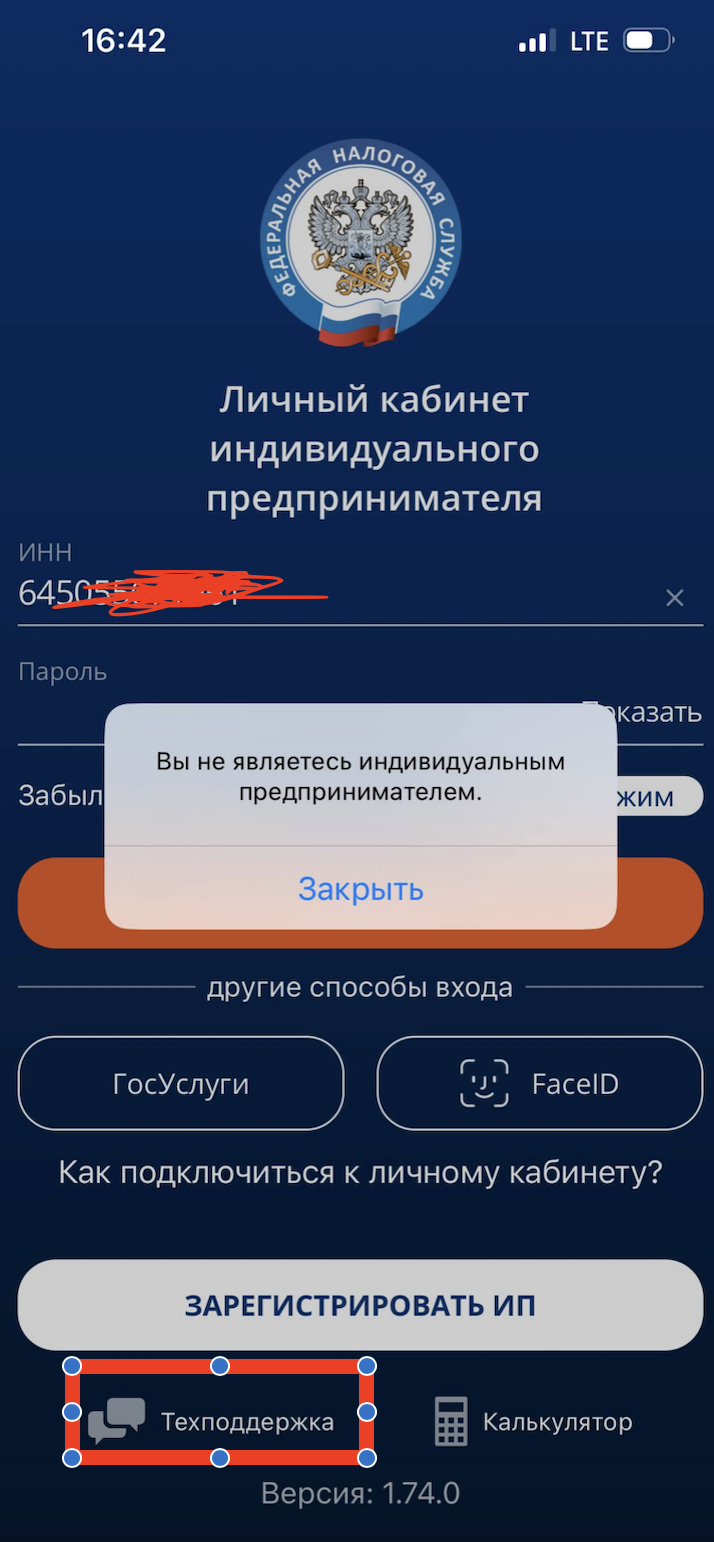Внизу приложения ЛК для ИП есть строка техподдержка