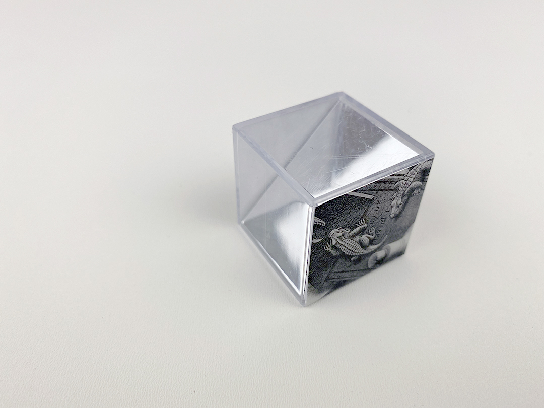 Каждый кубик имеет две прозрачные грани, которые взаимосвязаны между собой расположенным внутри кубика зеркалом. На остальных гранях располагаются фрагменты изображений Эшера: