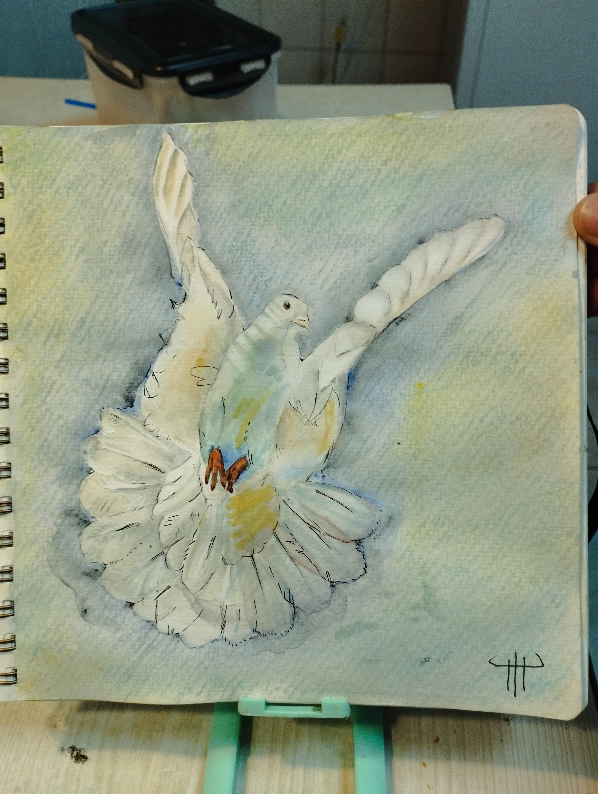 Голубей рисовала, а вот белого пока нет. Светлое на светлом рисовать не так просто. Пришлось помимо акварели использовать пастель и маркеры для скетчинга. Всем бобра