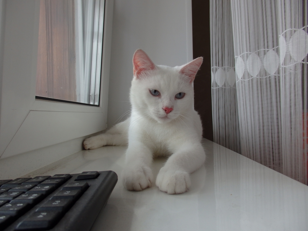 Да вряд ли он с ангоркой в родстве, шерстка у него очень густая, но жёсткая, прям как у козлика)))) Ангорки вроде "мягенькие" очень, скорее просто голубоглазый белый дворокот)