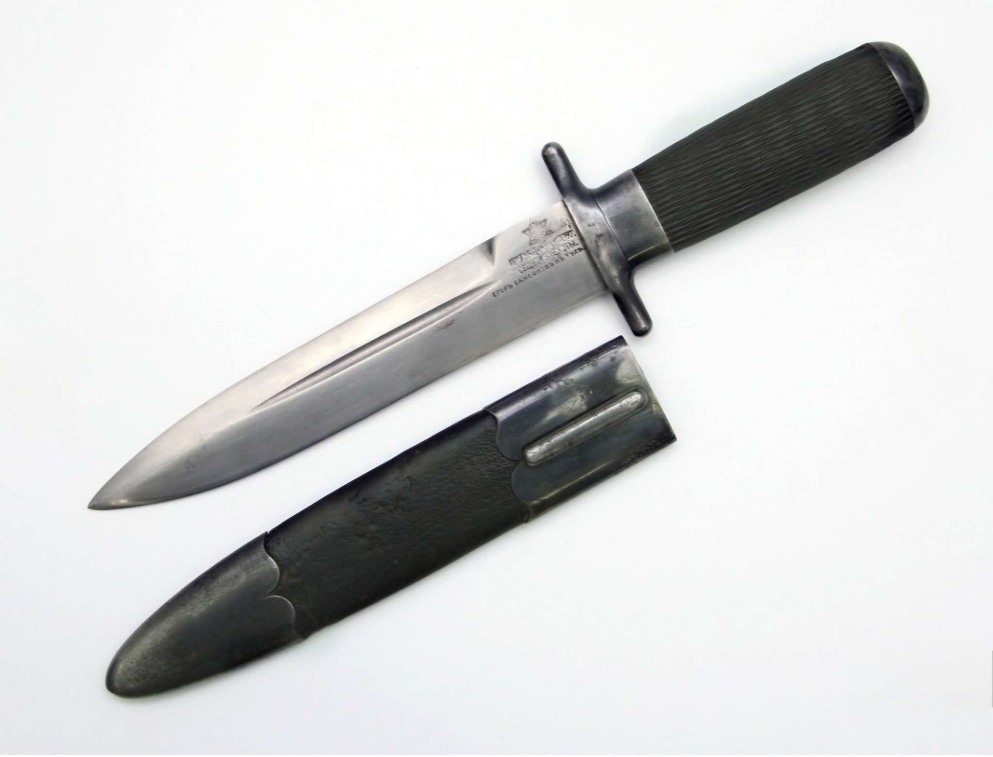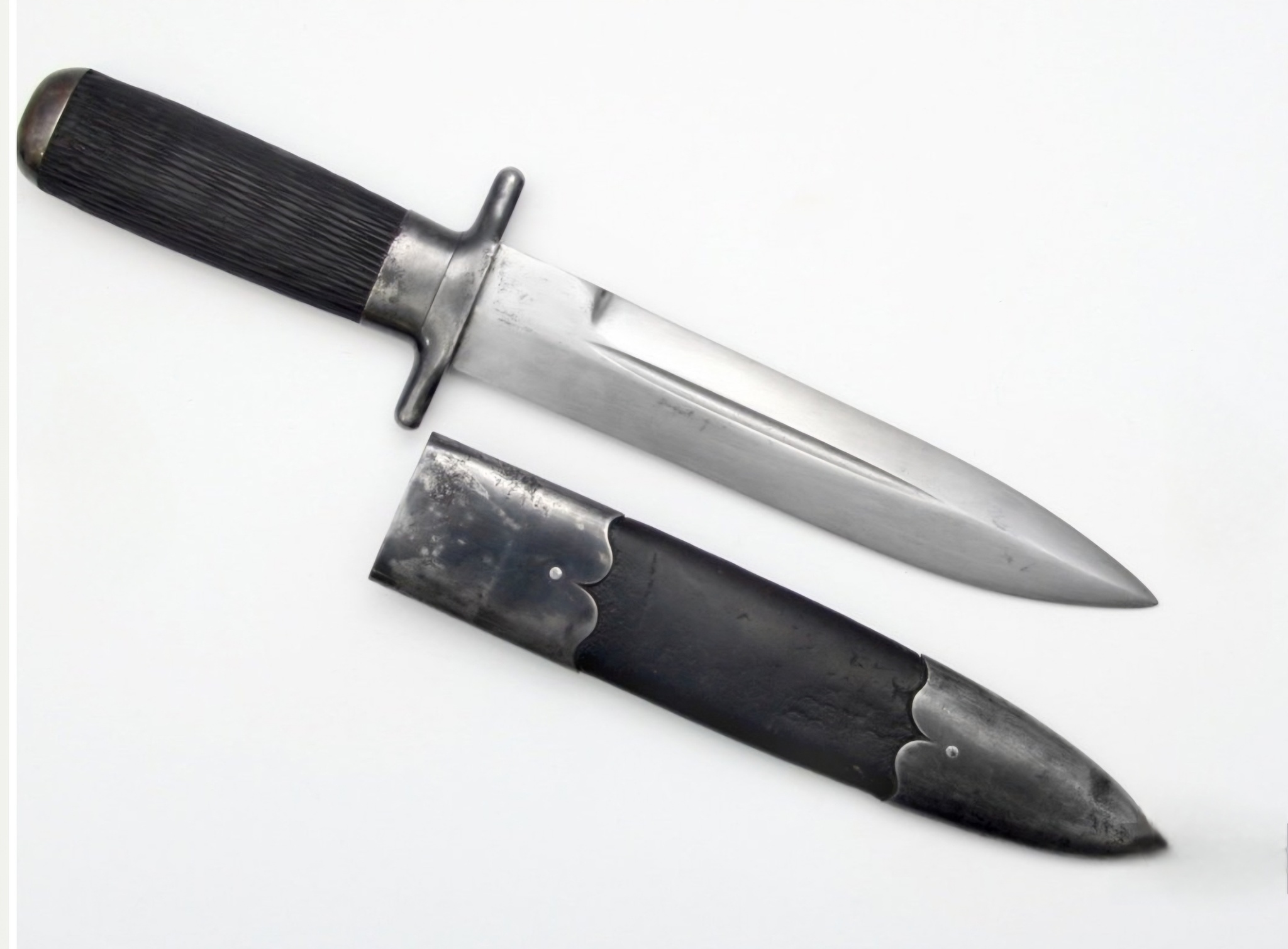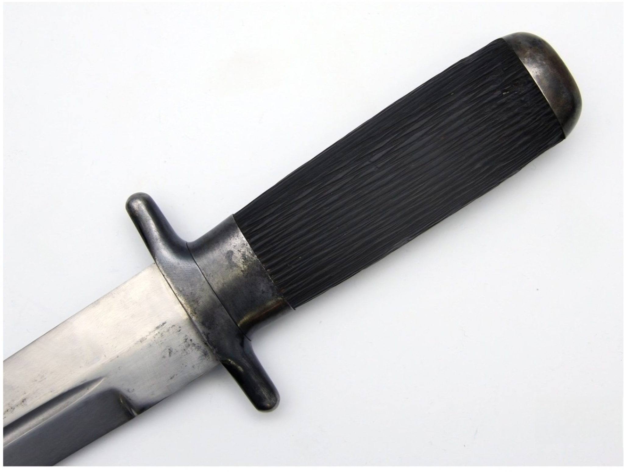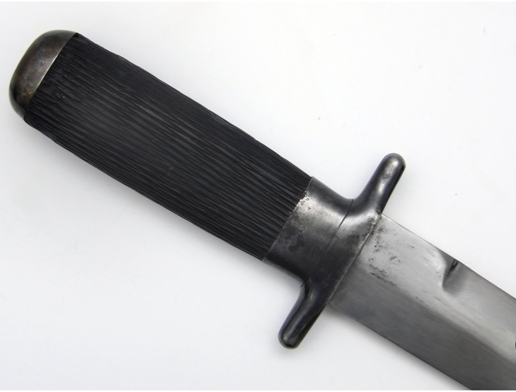 Рукоять из черного рога с рифленой поверхностью. Прибор рукояти и ножен стальной, покрыт воронением.