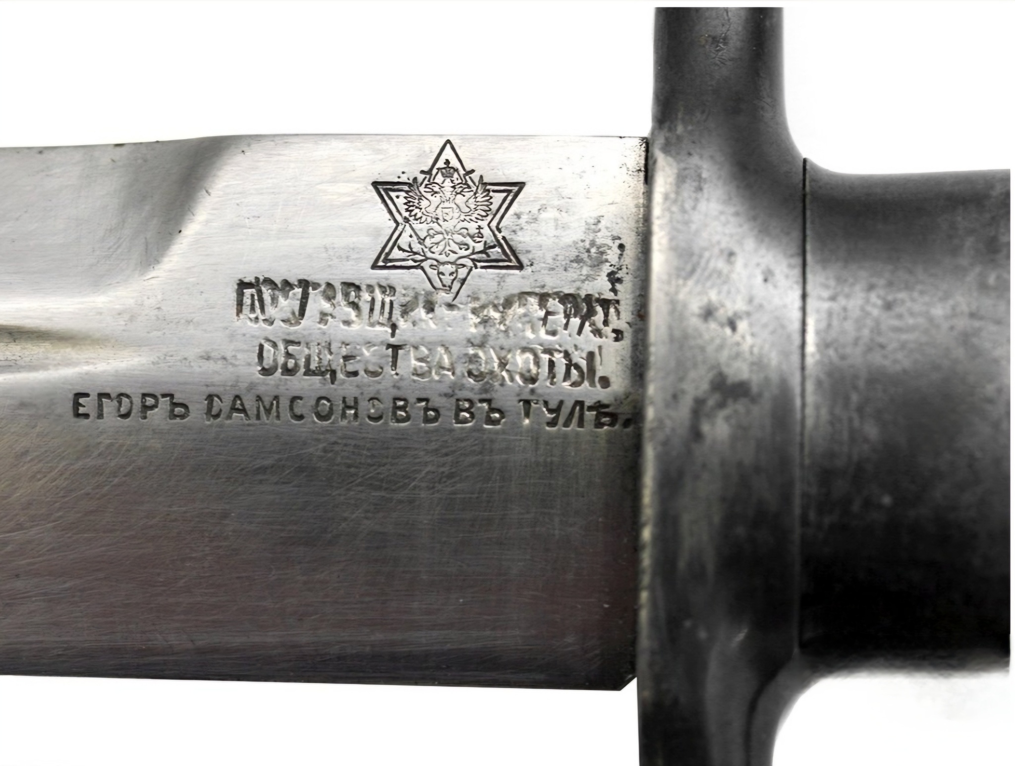 черной кожей. Клинок традиционной формы с одним долом, маркирован клеймом "Егор Самсоновъ в Туле" и