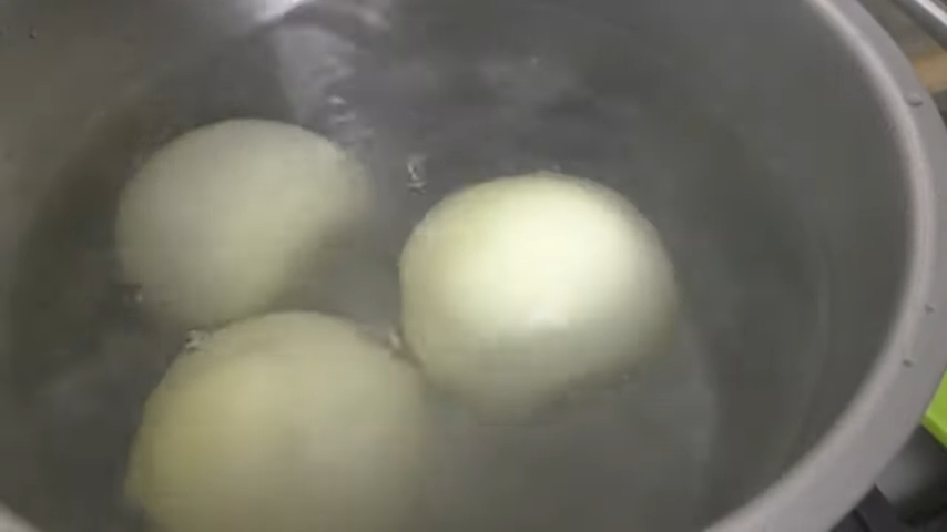 Каждую луковицу надрезаем до половины и отправляем в кипящую воду (подсоленную), варим минуты 3.