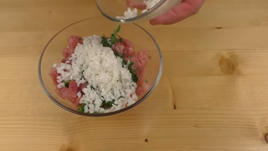Для начинки соединяем фарш, зелень и пропаренный рис. Солим, перчим, хорошо перемешиваем.