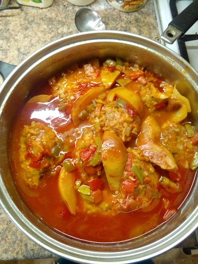 - За замены томатного сока писал выше, но повторюсь. Ибо для гастроманьяка не облом в очередной раз написать о продуктах. Я использую домашний томатный сок, уверенный. Он немного гуще обычного и я использую его в качестве заготовки для соусов. Но можно брать томаты в собственном соку, томатную пасту, разведенную водой, просто вкусный томатный сок или сделать вариант без томата, а просто влить бульон. Некоторые мешают томатный сок со сметаной, но это не мое, даже пробовать не хочу.
