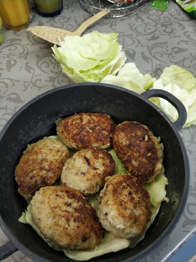 -Выложить сверху котлеты. Присыпать травами. Если в один слой не получилось, накройте сверху листьями, а сверху сложите оставшиеся котлеты. Вновь присыпать травами и черным перцем, накрыть капустными листьями. Залить томатным соком. Если кастрюля у вас высокая и сока оказалось мало, можно добавить либо сок, либо бульон, либо томат-пасту, разведенную с водой, либо разбавленный томатный соус, либо просто добавить воды.