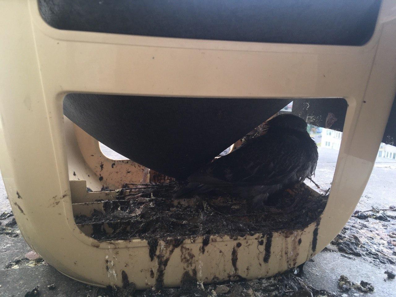 В общем, лежал себе там коврик, потом его обосрали голуби, мне было лень стирать его, и он лежал там дальше ещё довольно долго. В один прекрасный день решила, что с него довольно, и пошла забирать. Захожу на балкон, откуда-то выпрыгивает голубь, я без задней мысли забираю коврик со стульчика. И чуточку прифигела. Совсем чуточку.