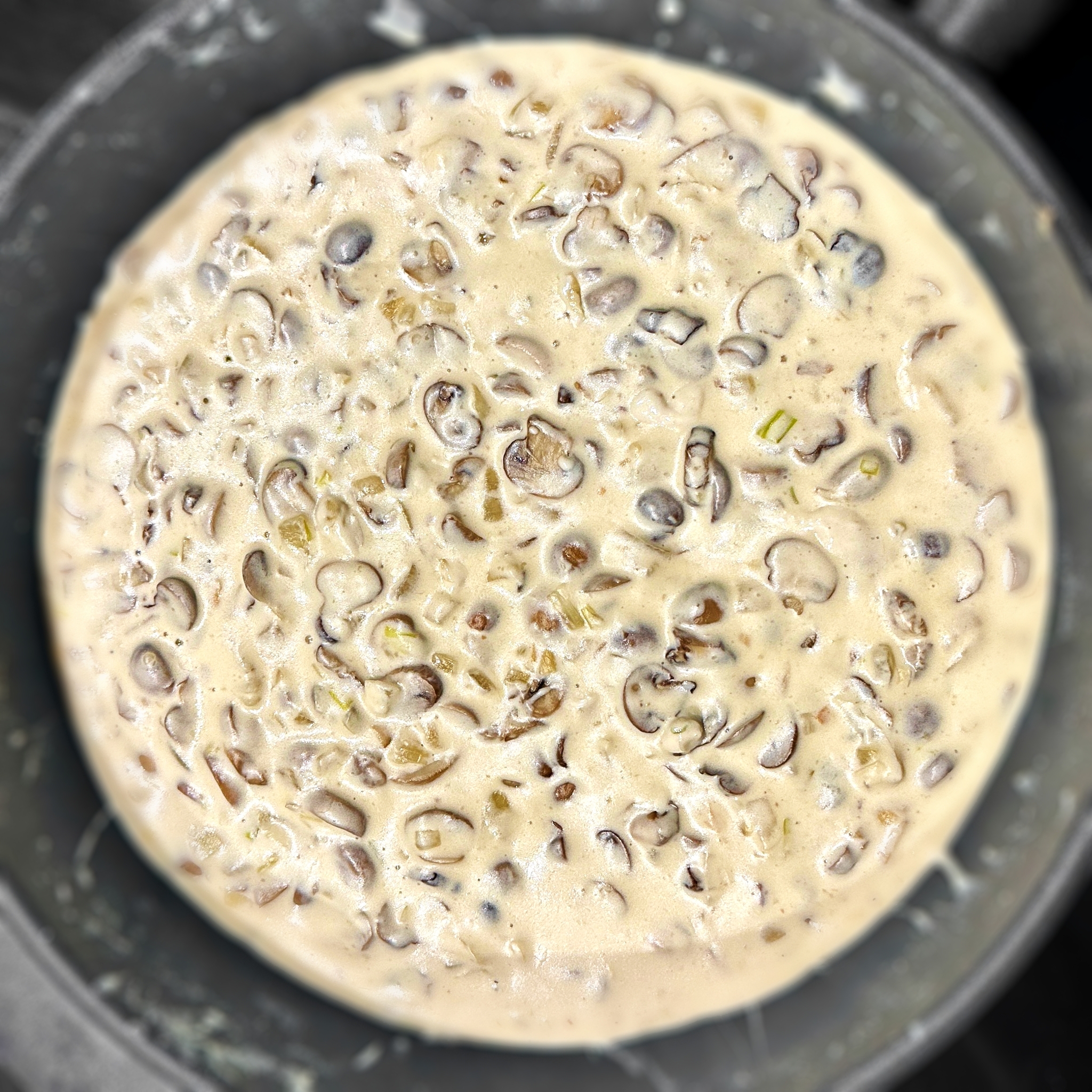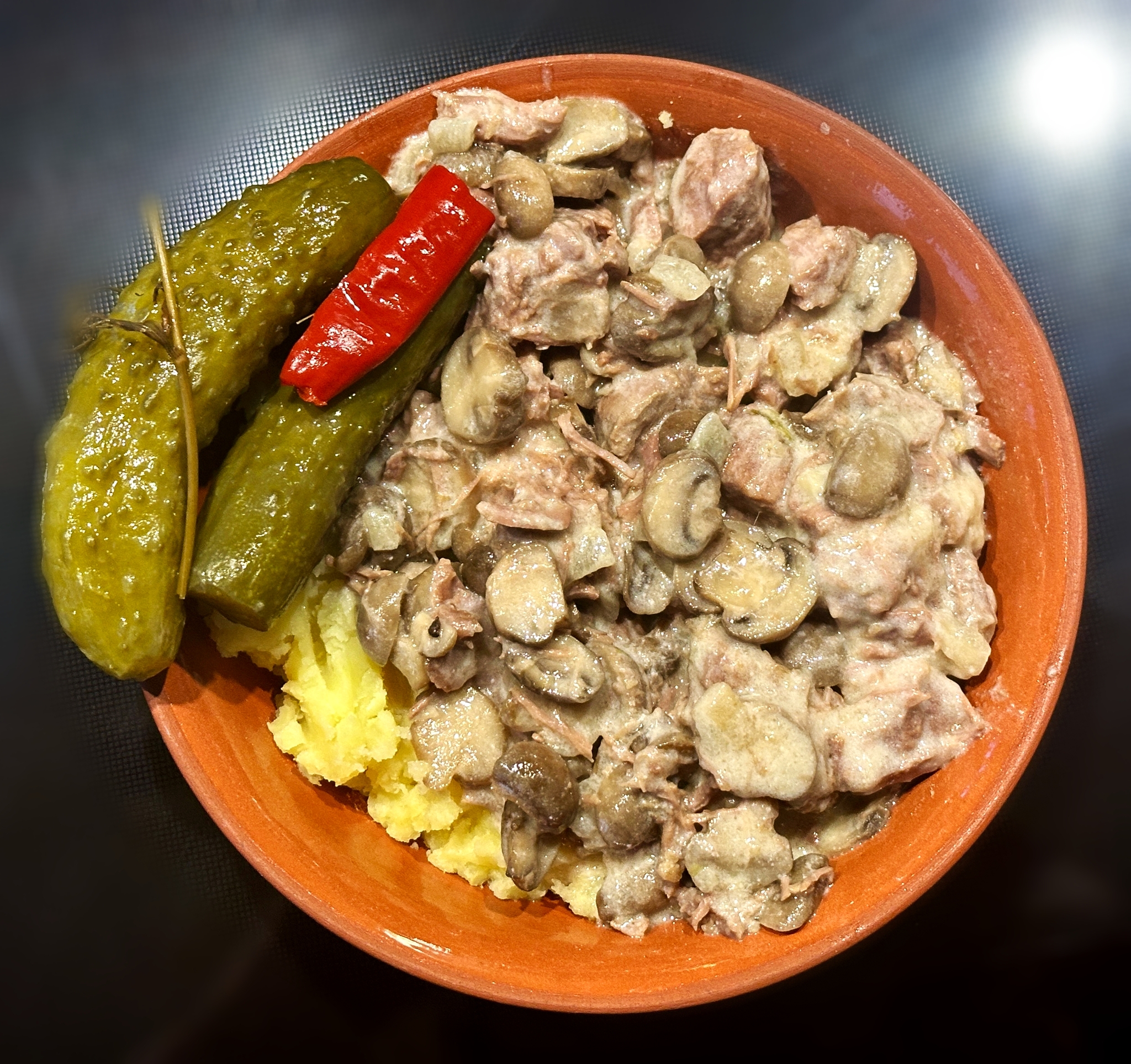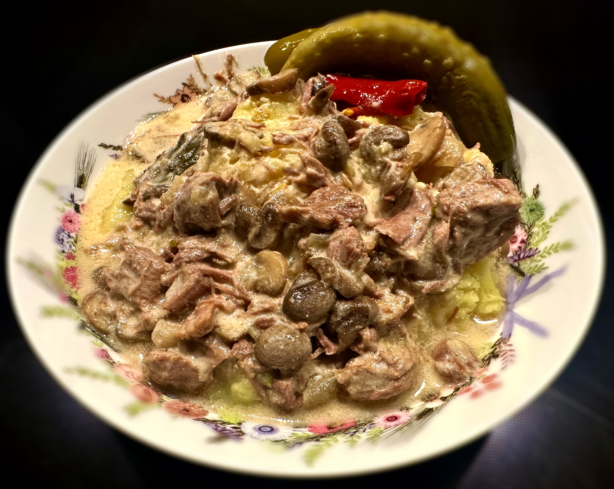Если говорить в бытовом, так сказать разрезе, или в стиле, что ли, наших домашних кухонь — это скорее «мясо с грибо-сливочной подливой». Ибо «соус», он, в общем, нечто другое подразумевает.