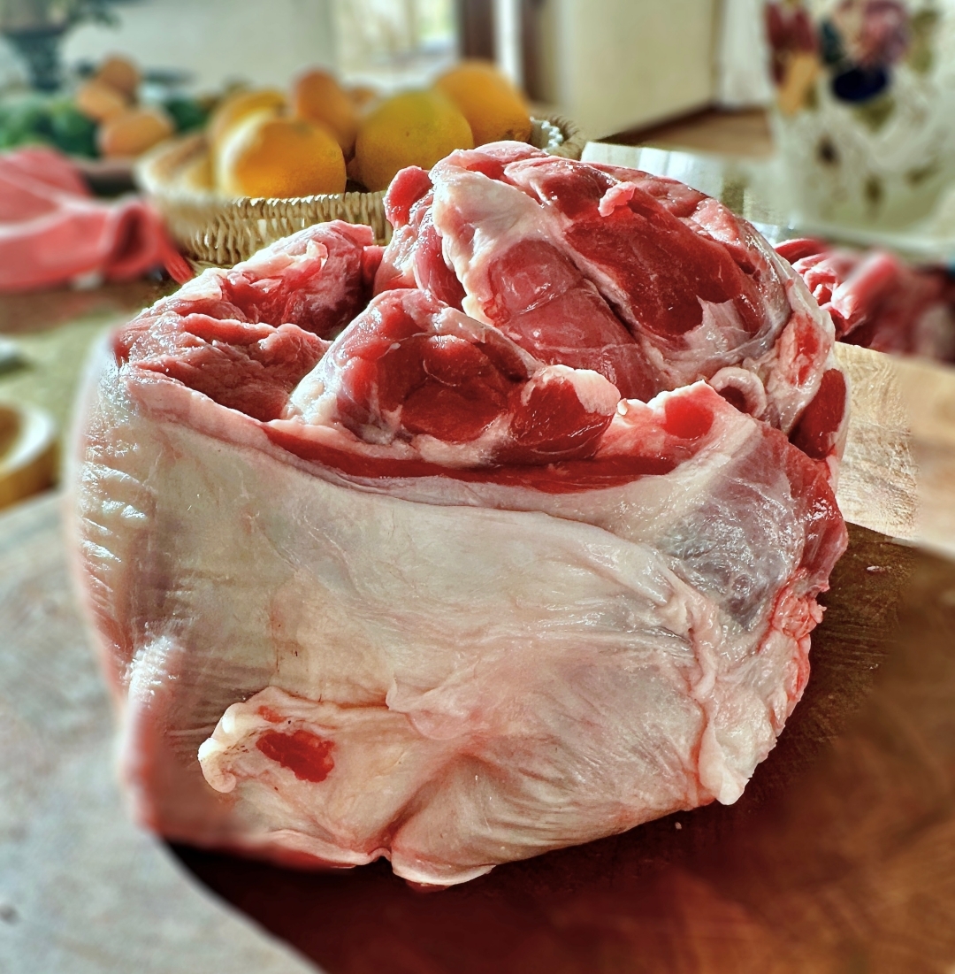 Голяшка (на фото она уже без кости) — мышечная часть передней или задней ноги. В ней оптимальное соотношение мяса, жира и соединительной ткани.