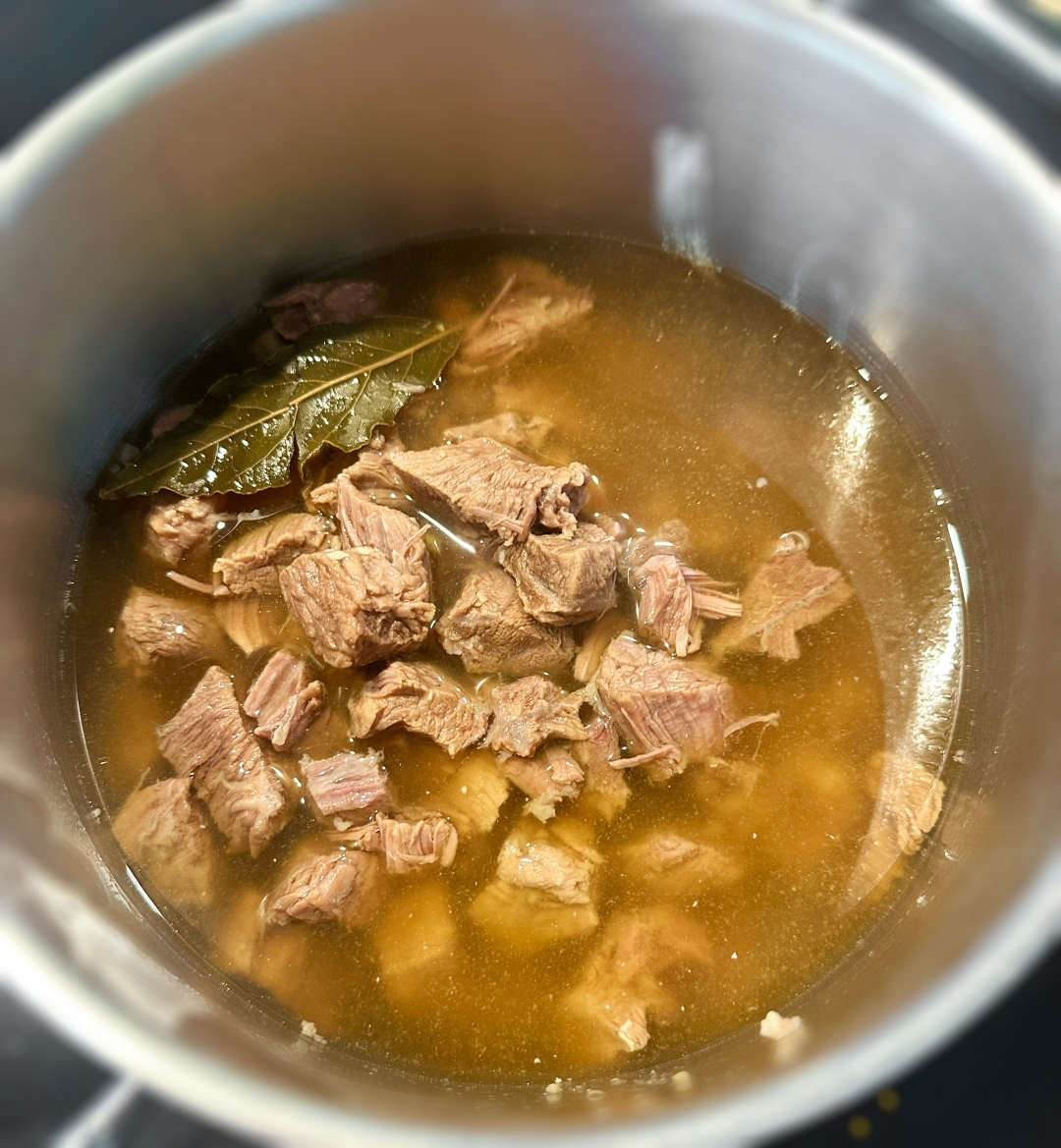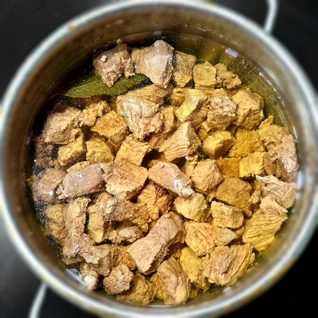 А правильное приготовление — это тушение, а вернее сказать - томление. Долгое и на невысокой температуре. 2–3 часа. И чтобы никакого даже намёка на кипение. Так - редкое взбулькивание. в кастрюльке с водой и специями. Можно еще и овощи добавлять.