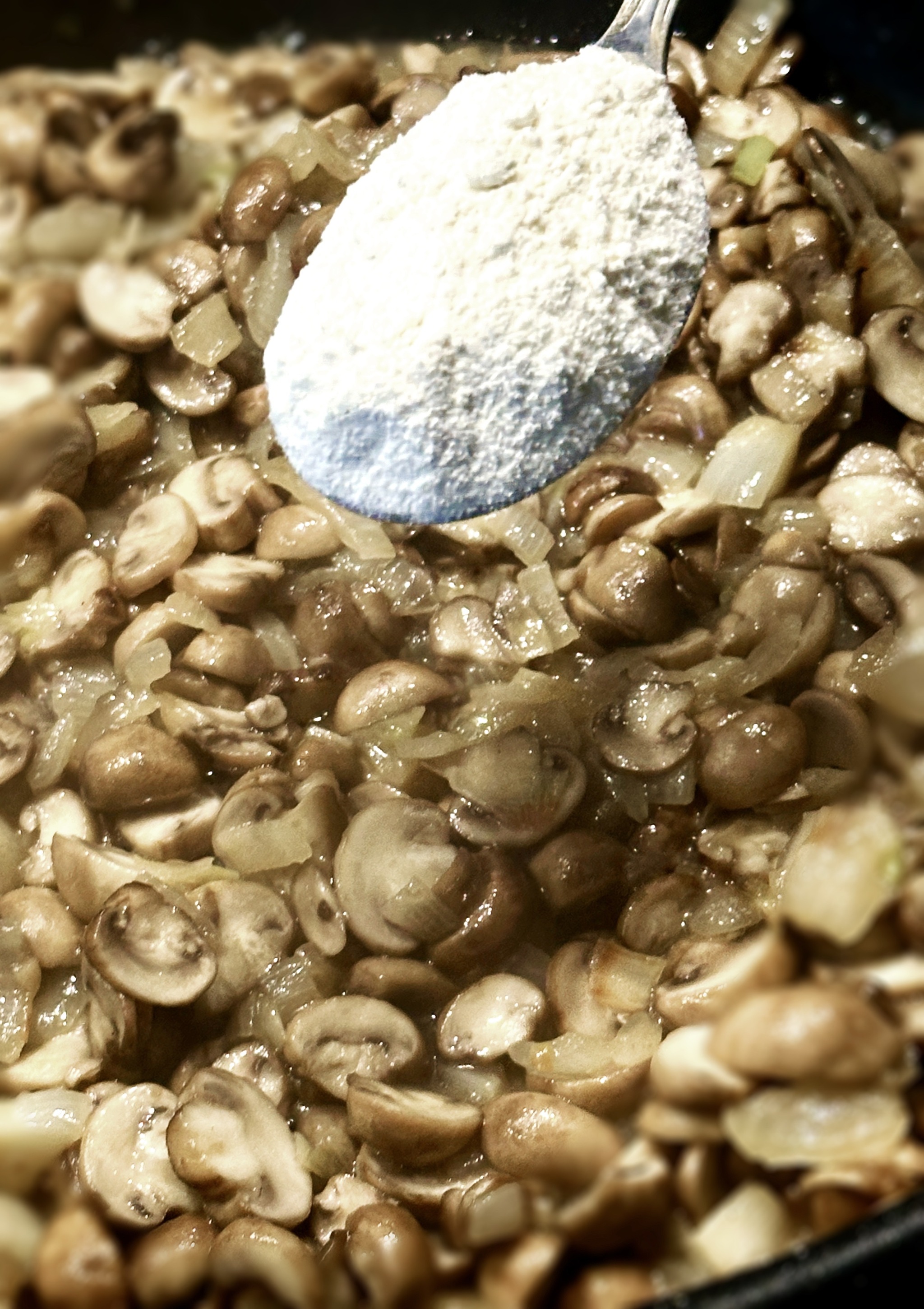 Столовая ложка «с хорошим верхом» муки. К грибо - луковой смеси. И тщательно перемешивая, несколько минут эту смесь прогревал. Чтобы слегка подрумянилось.
