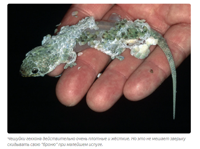 Вместо обычной чешуи, которую мы привыкли видеть на холоднокровных тварях, этот чудик нарядился в рыбью! Среди своих родственников его «кольчуга» самая крупная, вот и кажется похожей на рыбье обмундирование. Но в отличие от большинства, своими доспехами геккон не защищается. Всё в точности до наоборот, при любом удобном случае он их сбрасывает!