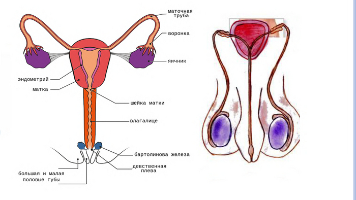 Пока мы живём в уютной, но тесной квартире под названием материнская утроба, в срок до 7 недель зачатки причиндалов у нас всех – и мальчиков и девочек – абсолютно одинаковые. Такая себе универсальная "барби-заготовка", которая называется половой бугорок. С седьмой недели гены запускают процесс развития половых органов: в первую очередь формируются гонады (половые железы) – яичники у будущей девочки, семенники у мальчика (на рисунке фиолетовеньким).