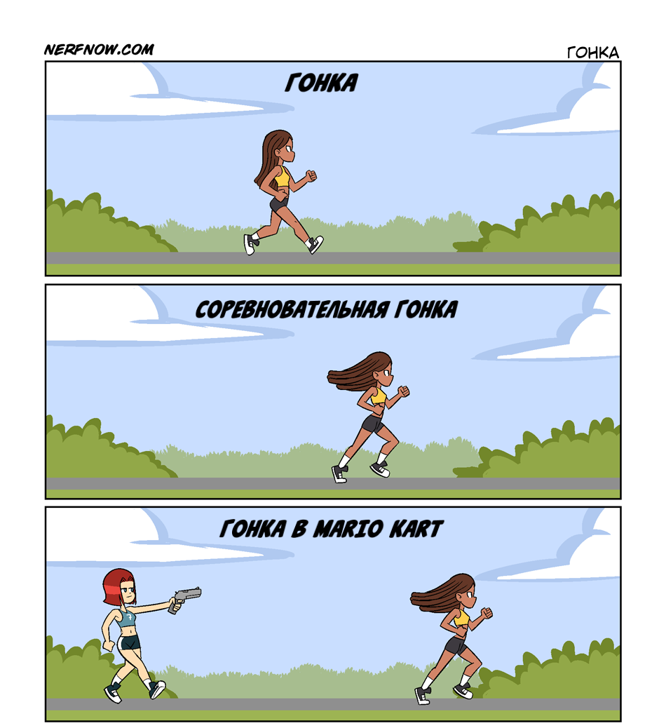 Комментарий автора NerfNow: Я не против бевых гоночных игр, но Mario Kart сейчас это наполовину умение, а наполовину убийство спамом предметами. Хороший игрок всё равно в среднем добьётся лучших результатов, но некоторые гонки просто невозможно выиграть, и это не весело. Это игра, которая агрессивно наказывает вас за то, что вы добиваетесь успеха.