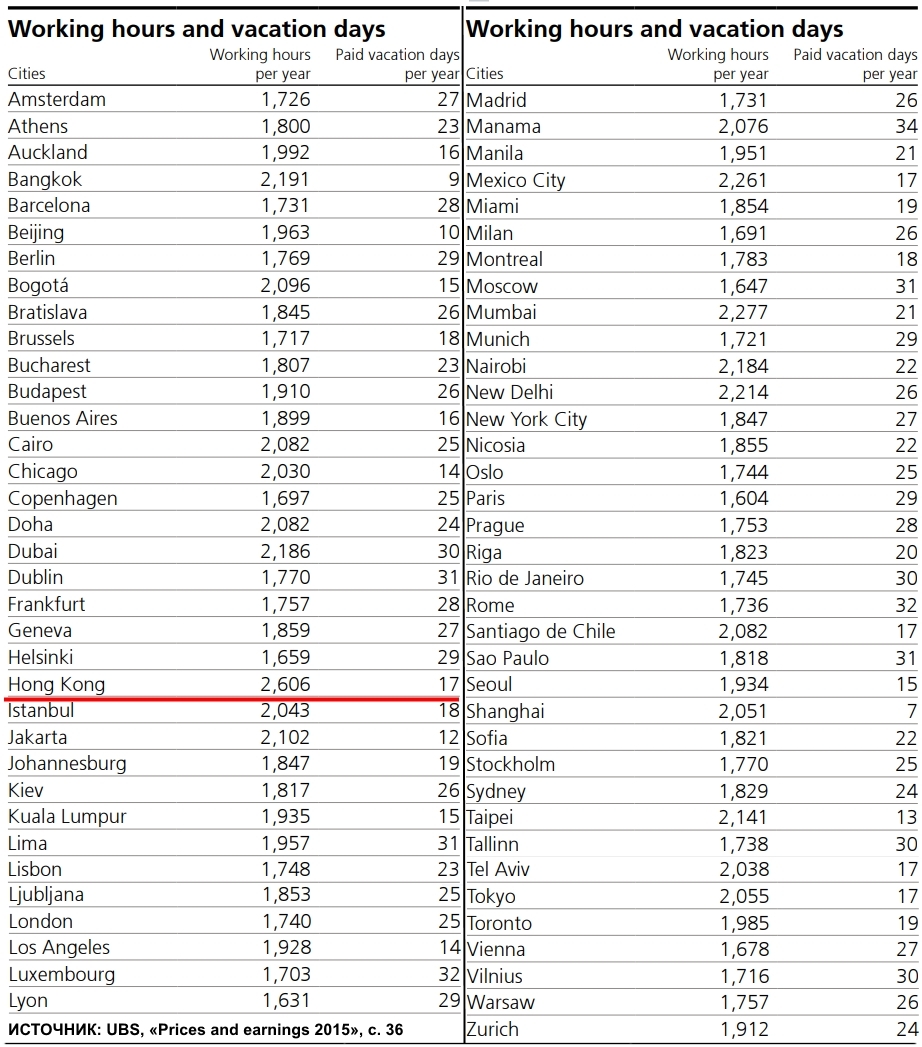 Как показывает исследование компании UBS, в 2015 году обитатели Гонконга отработали 2 606 часов. Гонконгцы опередили токийцев на 551 час, а жителей Сеула – на 672 часа. По данным ОЭСР, ни в одном развитом государстве не работали так много. Даже обитатели Южной Кореи, которая славится жесткой эксплуатацией работников, в 2015 году выработали в среднем 2 083 часа. Это на 523 часа меньше, чем гонконгцы. Для сравнения, немцы в том же году отработали почти в два раза меньше, чем жители Гонконга – 1 370 часов. Французам пришлось трудиться 1 519, а русским – 1 978 часов.