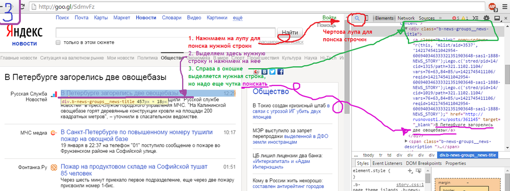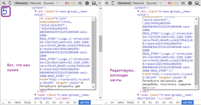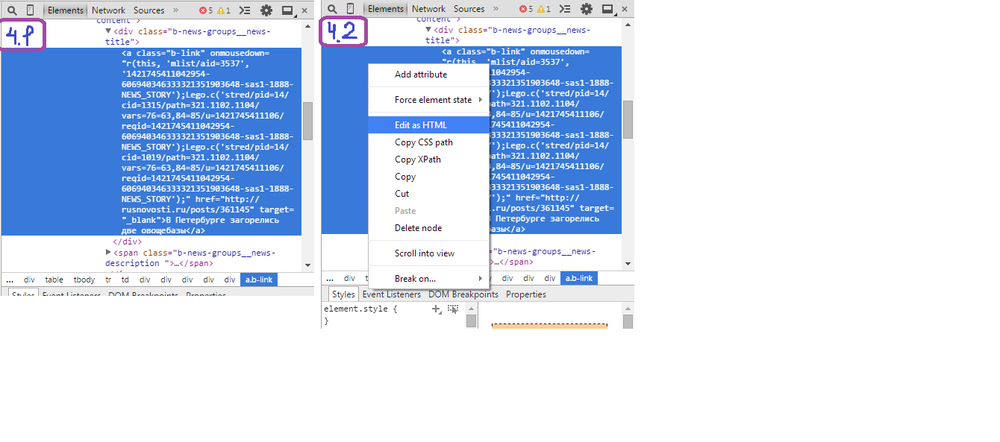 Спокуха, ща разберемся. 1. Итак, выбираем подопытную страницу, мой выбор пал на вот эту: http://news.yandex.ru/yandsearch?cl4url=rusnovosti.ru%2Fpost... 2. Правой кнопкой мыши нажимаем на любое свободное место на странице, для удобства, кстати, если редактируемые словечки содержат в себе какую-либо ссыль (как в моем примере), можно жмакать прям на них, и выбираем пункт "Просмотр кода элемента". 3. Далее, нужно найти в этом самом коде нужные нам для редактирования строчки. Если у Вас браузер хром (не знаю как на остальных) можно жмакнуть на лупу для поиска нужной строки в выскочившем дьявольском окошечке, и навести на нее, она выделится, нажать на нее, и справа в этом самом окошечке она выделится тоже. 4. В окошечке с непонятным эльфийским выделяем найденный в прошлом шаге текстовой блок (4.1) и нажимаем на него правой кнопкой мыши, в выпавшем окошечке выбираем строчку "Edit as HTML", либо просто жмем быстро, но нежно два раза по этому самому блоку шайтанова текста 5. Теперь, хвала богам, текст доступен для редактирования, и тут можно дать волю фантазии. Изменять надо то, что хотите изменить (с) 6. Жмем в любом свободном месте 7. PROFIT