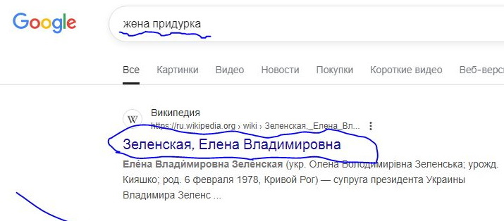 Сегодня искусственный интеллект Google выдал потрясающий хит. Проверял лично. В топе на запрос "Жена придурка" поисковик выдаёт ссылку на статью про Елену Зеленскую в Википедии.
