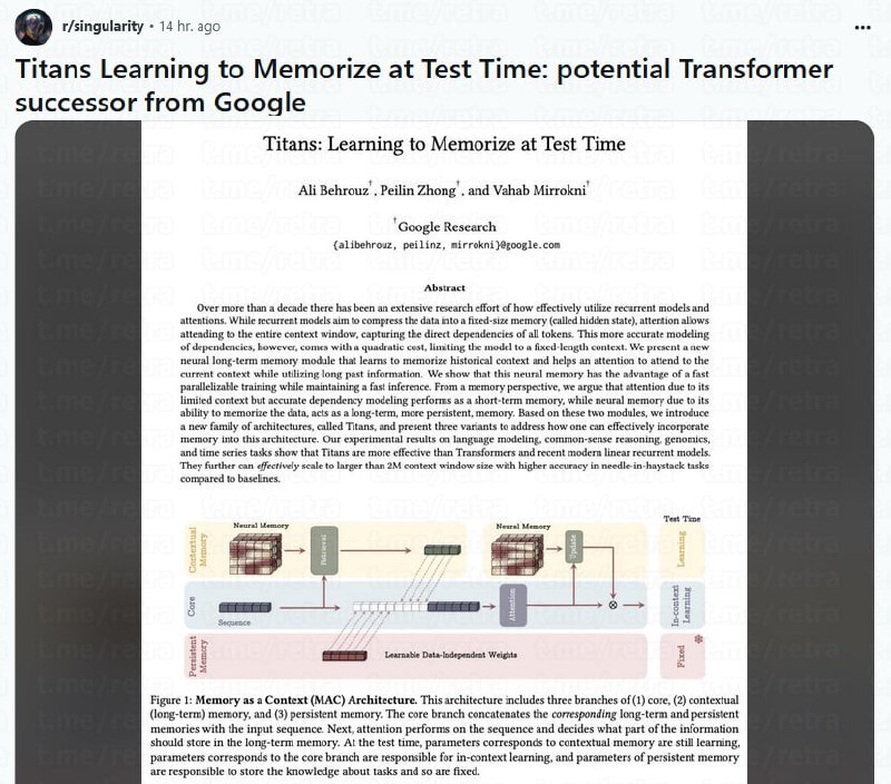 В Titans реализована долгосрочная, краткосрочная и постоянная память. Эта модель теперь может выборочно забыватьненужную информацию, запоминая важное. Как и мозг человека, долгосрочная память обучается и обновляется, адаптируясь к новой информации, а также поддерживает параллельную обработку данных, что ускоряет обучение и делает систему более эффективной.