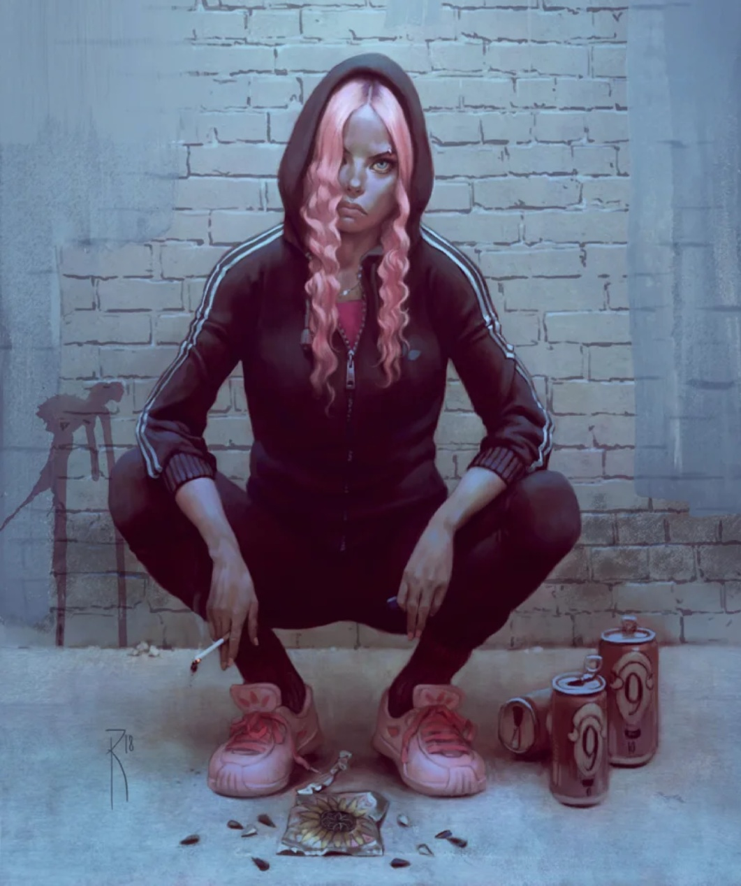 Безмолвные, накачанные ребята и подтянутые девки. Морды злые, спортивные штаны на них в полосках и у всех розовые волосы.