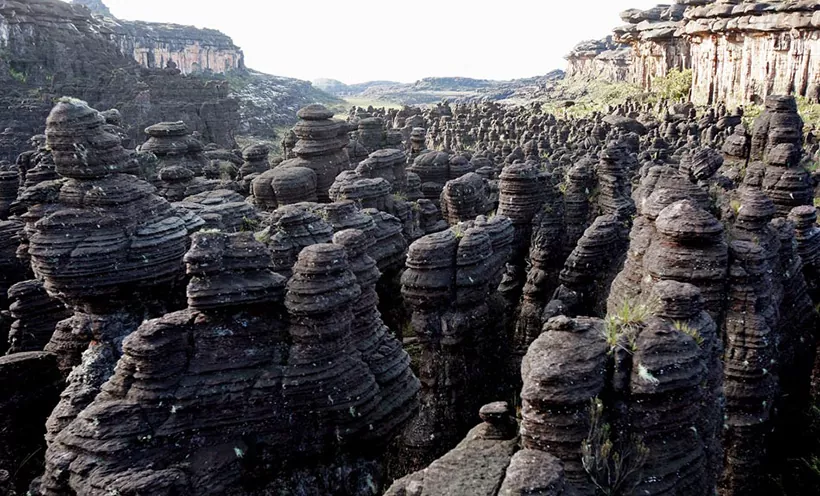 Что же представляет собой вершина Рораймы? Снизу кажется, что она должна быть абсолютно плоской, но на самом деле это далеко не так. Вся верхушка горы представляет собой пересеченную местность. На ней то тут, то там встречаются небольшие похожие на грибы холмы и заполненные водой впадины, на дне которых переливаются всеми цветами радуги кристаллы кварца. А главное – все плато буквально испещрено большими и глубокими трещинами, уходящими куда-то к основанию скалы, через которые перебраться без лестниц не представляется возможным.