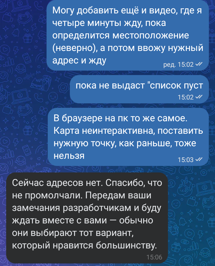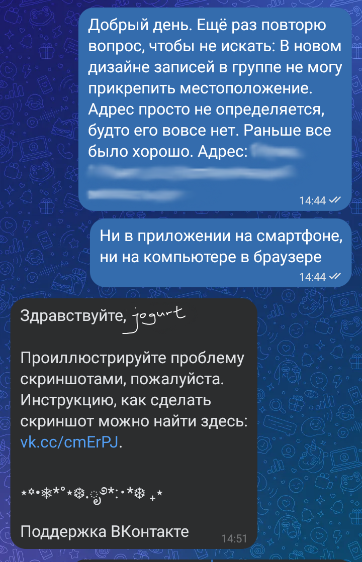 Не так давно Вконтакте обновили дизайн постов и их редактирование/создание в "лентах" групп. Теперь нет возможности прикрепить статью к новости, нет возможности прикрепить ссылку в тг (чтобы не текстом, а изображением внизу новости). Ладно, тут я извернулся и нашёл, что в старой версии приложения на андроид это все ещё можно делать и крепить, непрестанно ругая все подряд. Кстати, раньше я дико ненавидел админить со смартфона, а теперь это единственное возможный способ) Но окончательно сгорел я оттого, что теперь просто невозможно прикрепить местоположение. Я не могу тыкнуть в карту и поставить точку, которую мне надо. Я не могу набрать адрес и в выпадающем списке выбрать нужный. Функционал просто "не готов", как сказали в поддержке.