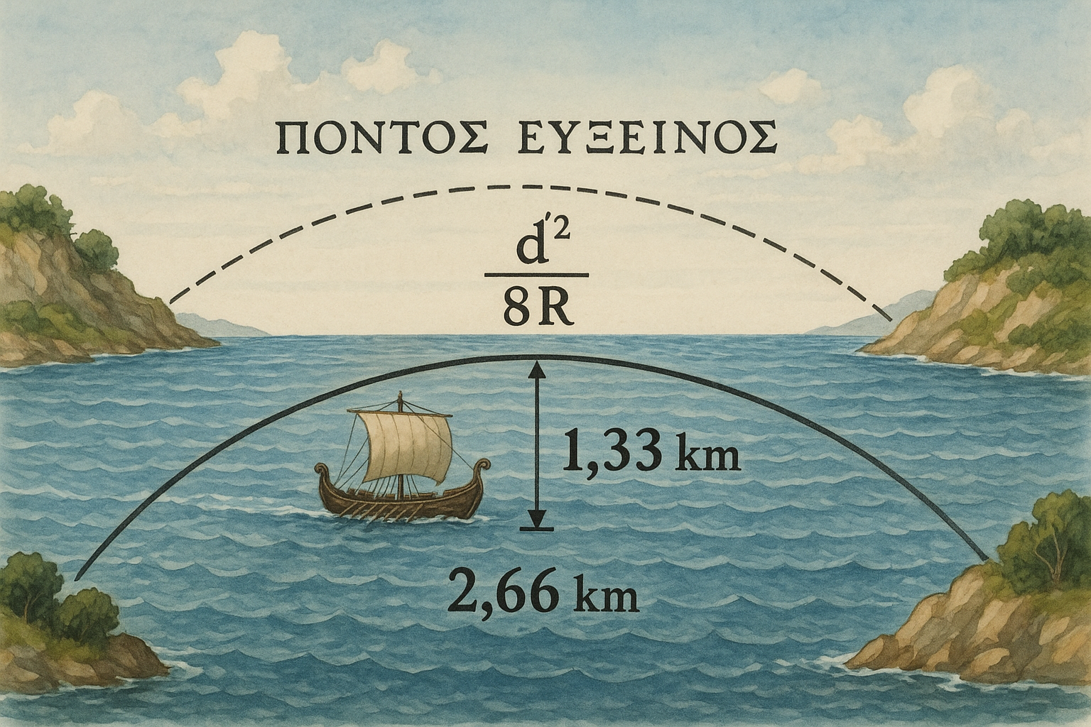 Расстояние от Синопа до Керчи — около 260 километров. Казалось бы, рукой подать. Но Земля у нас, как ни крути, круглая — и это портит весь поэтический настрой. Существует простая формула для расчёта прогиба между двумя точками на поверхности сферы: