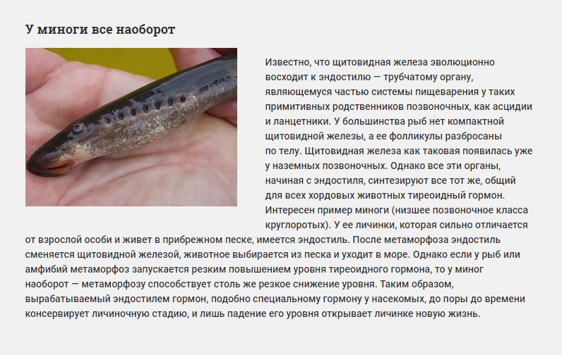 Но еще более важную роль тиреоидный гормон играет в развитии холоднокровных позвоночных, в частности рыб и амфибий. И особенно тех, в онтогенезе которых присутствует стадия метаморфоза — превращения из личиночной формы в зрелую. В статье «Недоразвитые первопроходцы» («ПМ» № 9'2012) подробно говорилось о феномене неотении. При неотении детская (ювенильная), часто личиночная форма живого существа никогда не приобретает вид взрослой особи, но продолжает расти и достигает половой зрелости. Так вот, выяснилось, что один из решающих факторов для возникновения неотении — пониженный уровень тиреоидного гормона.